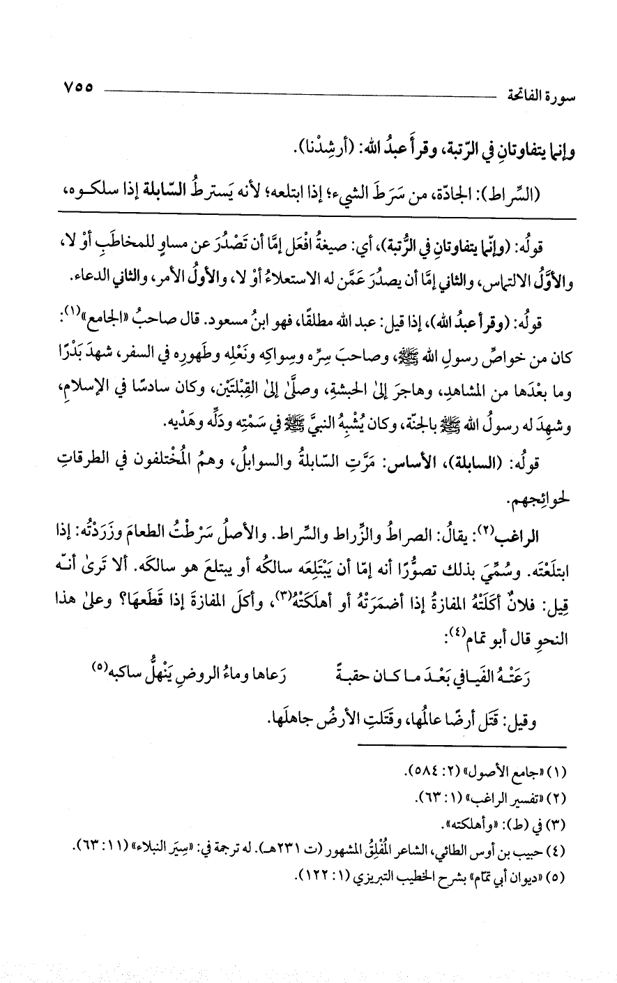 الراغب: يقال: الصراط والزراط والسراط. والأصل سرطت الطعام وزردته: إذا ابتلعته. وسمي بذلك تصوراً أنه إما أن يبتلعه سالكه أو يبتلع هو سالكه. ألا ترى أنه قيل: فلان أكلته المفازة إذا أضمرته أو أهلكته، وأكل المفازة إذا قطعها؟ وعلى هذا النحو قال أبو تمام: