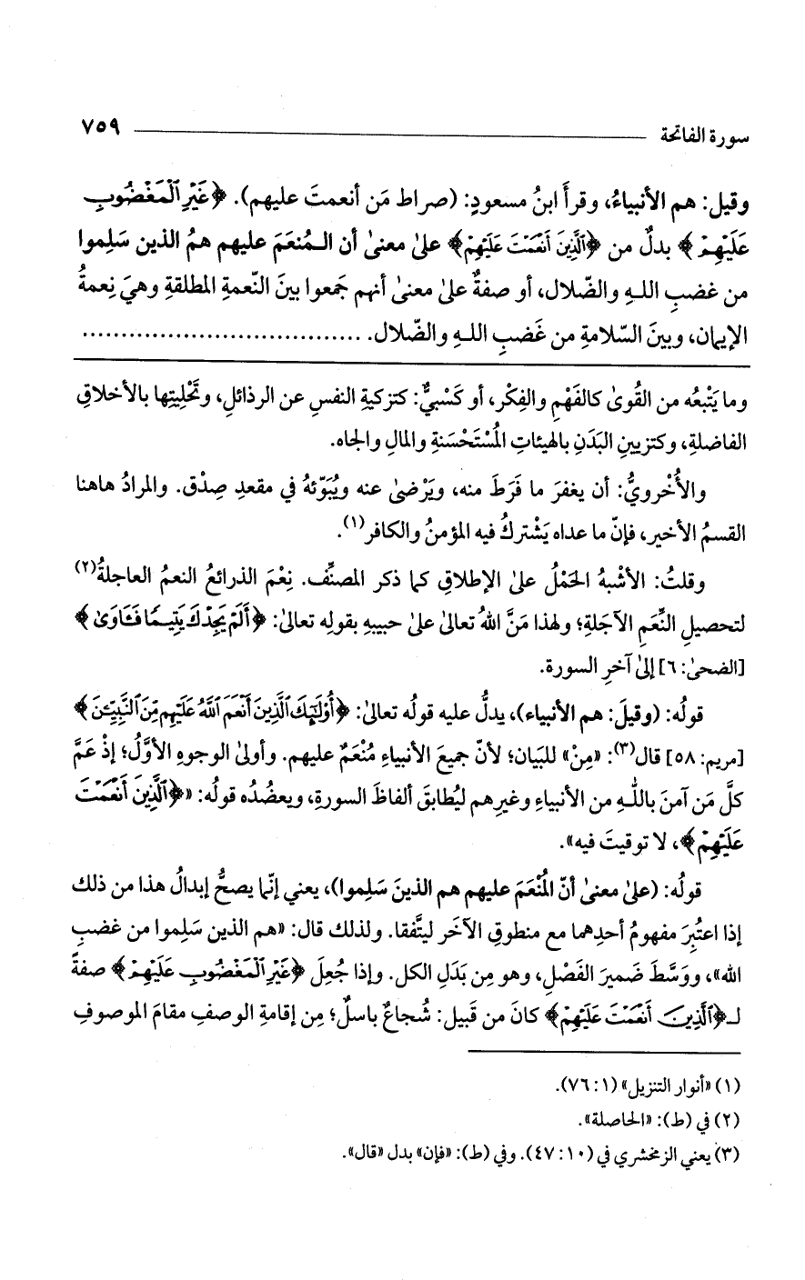 قوله: (وقيل: هم الأنبياء)، يدل عليه قوله تعالى: (أُوْلَئِكَ الَّذِينَ أَنْعَمَ اللَّهُ عَلَيْهِمْ مِنْ النَّبِيِّينَ) [مريم: 58] قال: "مِنْ" للبيان؛ لأن جميع الأنبياء منعم عليهم. وأولى الوجوه الأول؛ إذ عم كل من آمن بالله من الأنبياء وغيرهم ليطابق ألفاظ السورة، ويعضده قوله: (الَّذِينَ أَنْعَمْتَ عَلَيْهِمْ)، لا توقيت فيه".