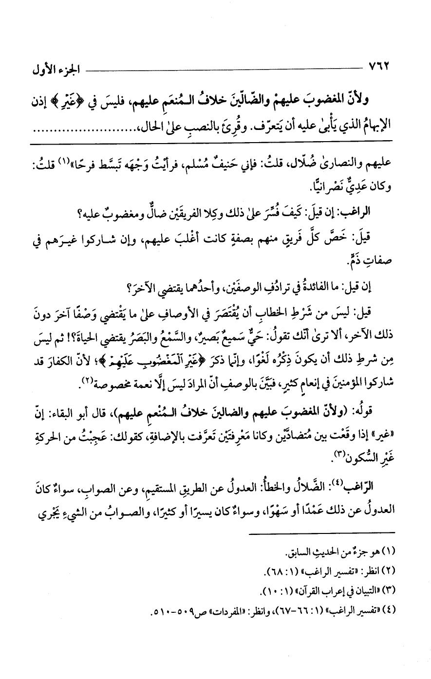 الراغب: إن قيل: كيف فسر على ذلك وكلا الفريقين ضال ومغضوب عليه؟