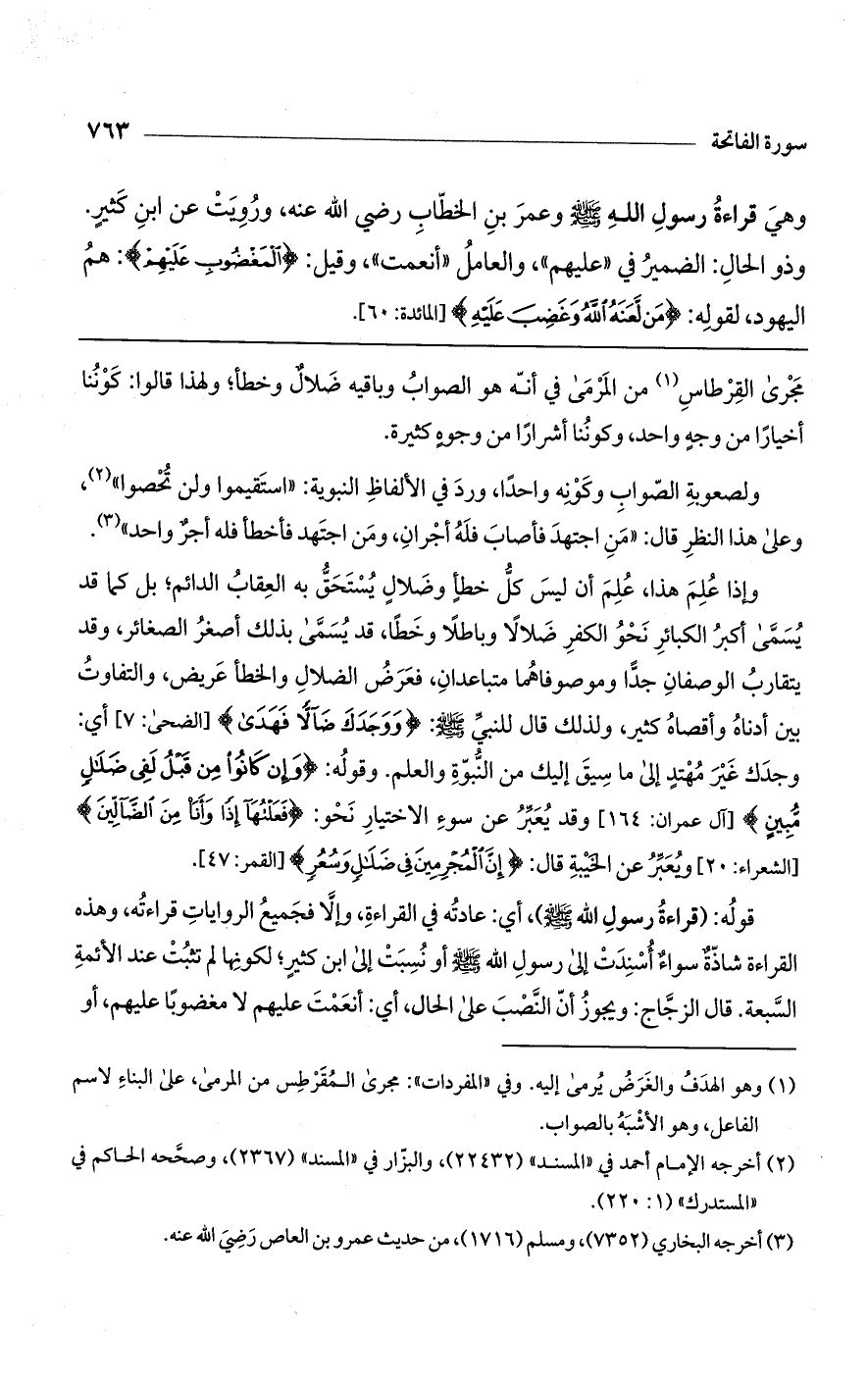 وإذا علم هذا، علم أن ليس كل خطأ وضلال يستحق به العقاب الدائم؛ بل كما قد يسمى أكبر الكبائر نحو الكفر ضلالاً وباطلاً وخطاً، قد يسمى بذلك أصغر الصغائر، وقد يتقارب الوصفان جداً وموصوفاهما متباعدان، فعرض الضلال والخطأ عريض، والتفاوت بين أدناه وأقصاه كثير، ولذلك قال للنبي صلى الله عليه وسلم: (وَوَجَدَكَ ضَالاًّ فَهَدَى) [الضحى: 7] أي: وجدت غير مهتد إلى ما سيق إليك من النبوة والعلم. وقوله: (وَإِنْ كَانُوا مِنْ قَبْلُ لَفِي ضَلالٍ مُبِينٍ) [آل عمران: 164] وقد يعبر عن سوء الاختيار نحو: (فَعَلْتُهَا إِذاً وَأَنَا مِنْ الضَّالِّينَ) [الشعراء: 20] ويعبر عن الخيبة قال: (إِنَّ الْمُجْرِمِينَ فِي ضَلالٍ وَسُعُرٍ) [القمر: 47].