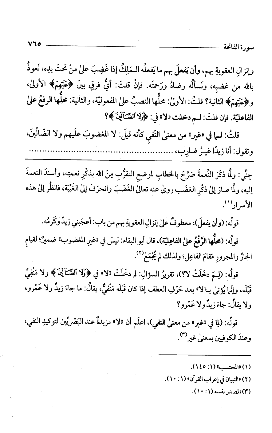 وإنزال العقوبة بهم، وأن يفعل بهم ما يفعله الملك إذا غضب على من تحت يده، نعوذ بالله من غضبه، ونسأله رضاه ورحمته. فإن قلت: أي فرق بين (عَلَيْهِمْ) الأولى، و (عَلَيْهِمْ) الثانية؟ قلت: الأولى: محلها النصب على المفعولية، والثانية: محلها الرفع على الفاعلية. فإن قلت: لم دخلت "لا" في: (وَلا الضَّالِّينَ)؟