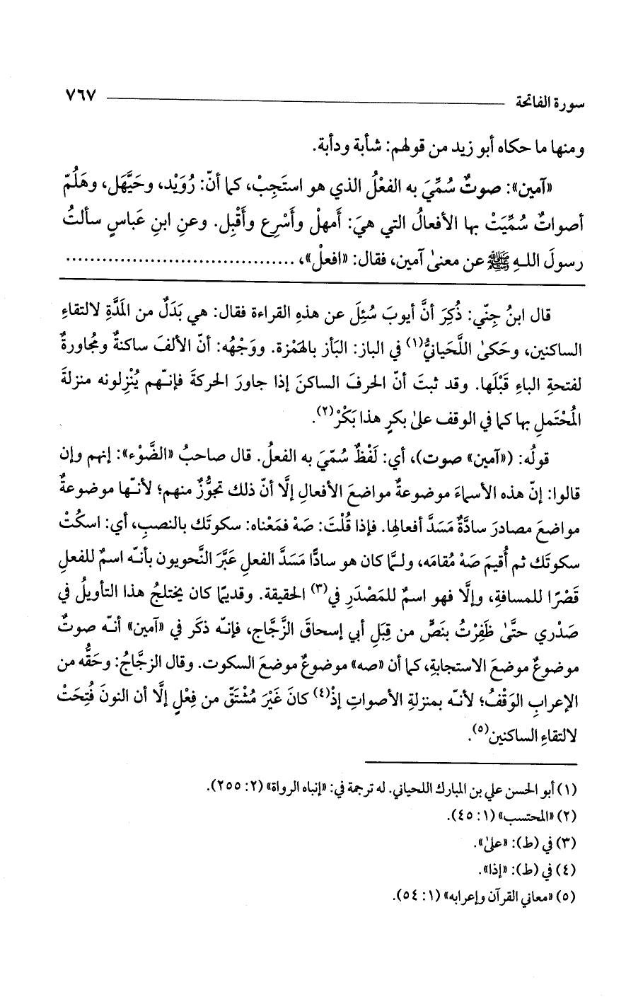 "آمين": صوت سمي به الفعل الذي هو استجب، كما أن: رويد، وحيهل، وهلم أصوات سميت بها الأفعال التي هي: أمهل وأسرع وأقبل. وعن ابن عباس سألت رسول الله صلى الله عليه وسلم عن معنى آمين، فقال: "افعل"،