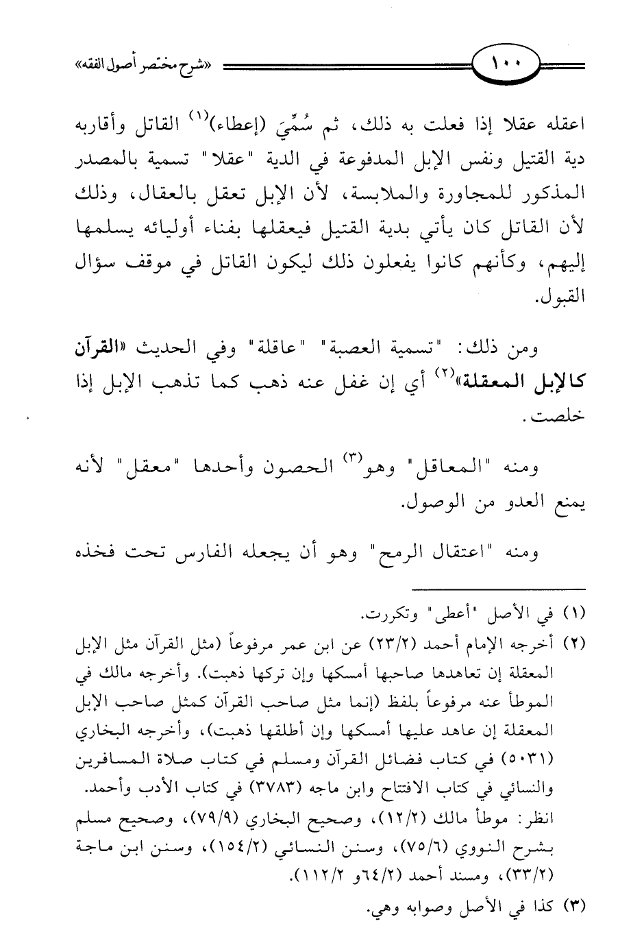 ومن ذلك: "تسمية العصبة" "عاقلة" وفي الحديث "القرآن كالإبل المعقلة" (¬2) أي إن غفل عنه ذهب كما تذهب الإبل إذا خلصت.