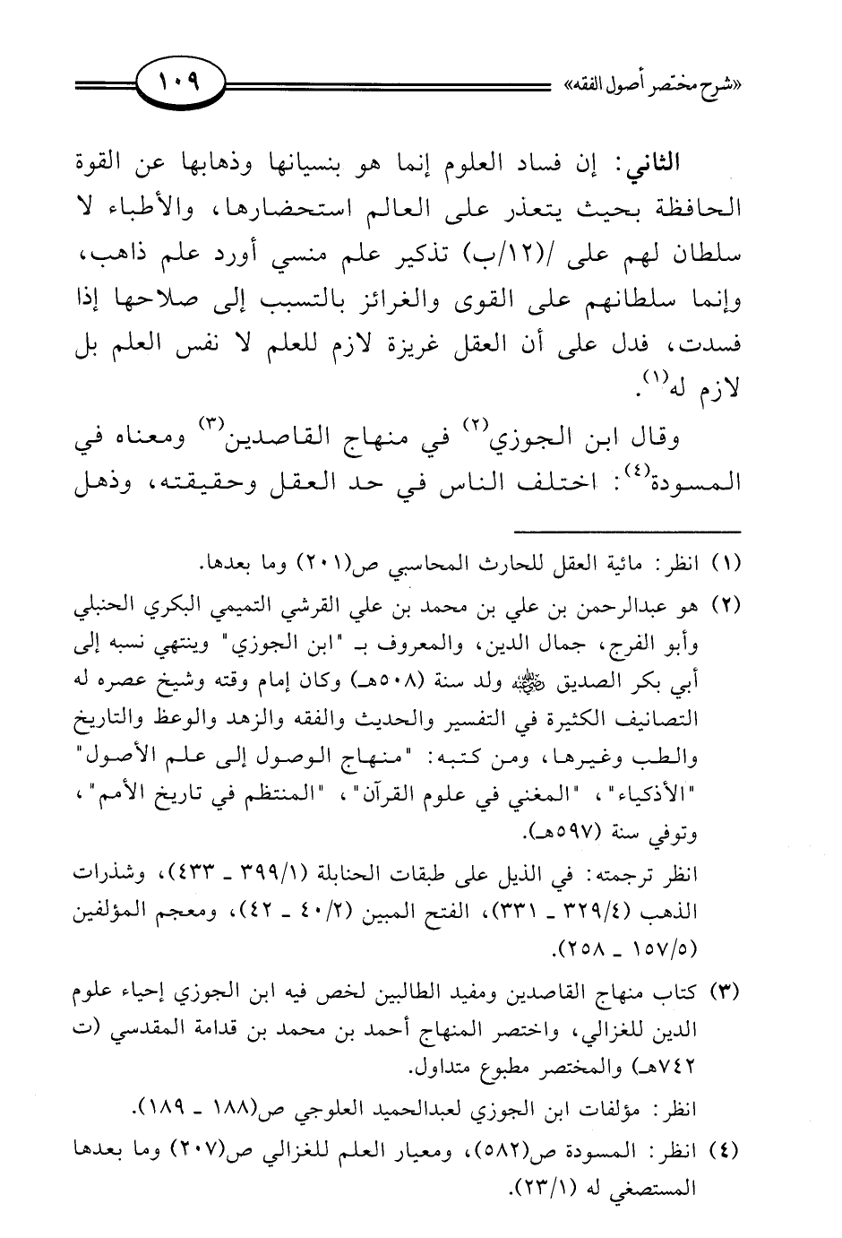 (¬2) هو عبد الرحمن بن علي بن محمد بن علي القرشي التميمي البكري الحنبلي وأبو الفرج، جمال الدين، والمعروف بـ "ابن الجوزي" وينتهي نسبه إلى أبي بكر الصديق - رضي الله عنه - ولد سنة (508 هـ) وكان إمام وقته وشيخ عصره له التصانيف الكثيرة في التفسير والحديث والفقه والزهد والوعظ والتاريخ والطب وغيرها، ومن كتبه: "منهاج الوصول إلى علم الأصول" "الأذكياء"، "المغني في علوم القرآن"، "المنتظم في تاريخ الأمم"، وتوفي سنة (597 هـ).