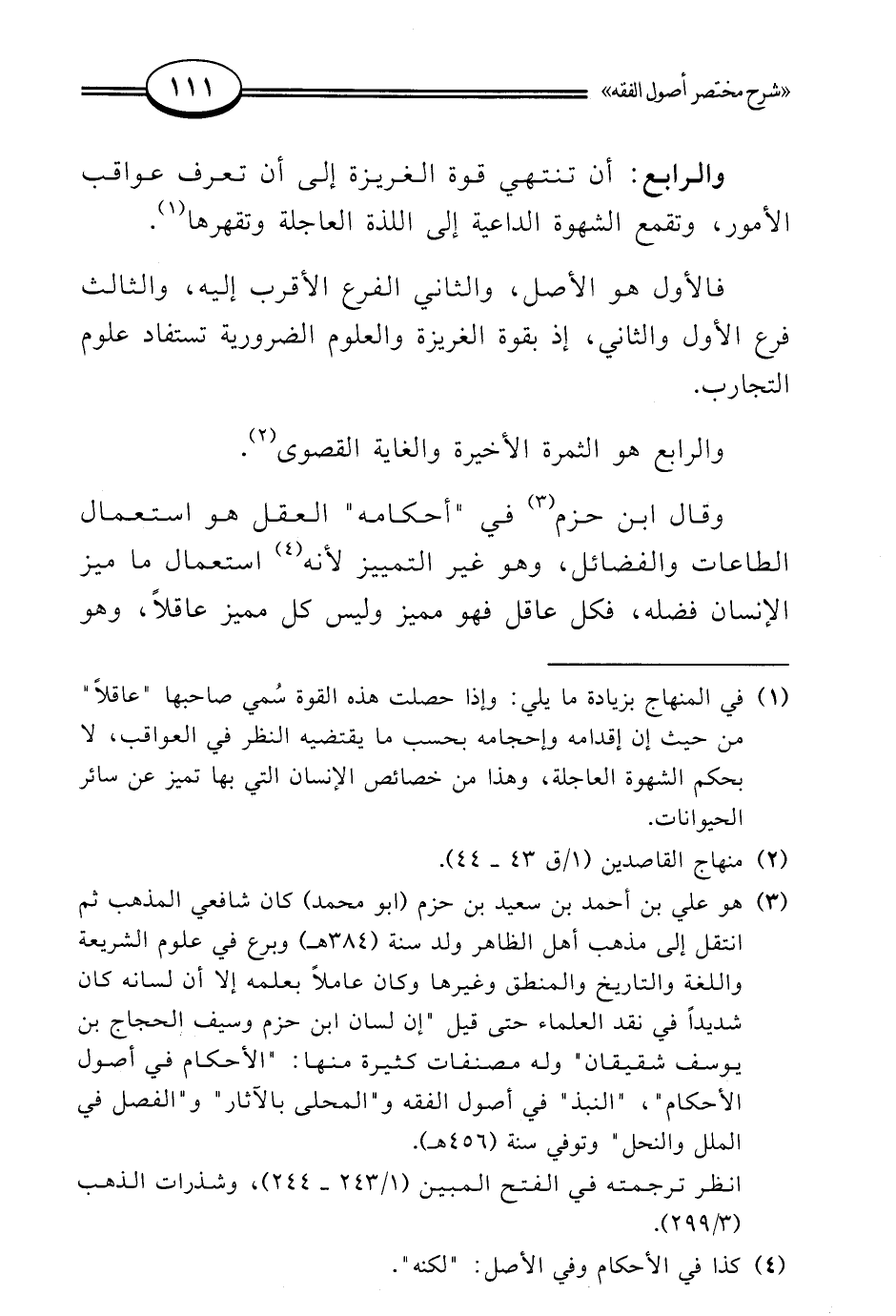 (¬3) هو علي بن أحمد بن سعيد بن حزم (أبو محمد) كان شافعي المذهب ثم انتقل إلى مذهب أهل الظاهر ولد سنة (384 هـ) وبرع في علوم الشريعة واللغة والتاريخ والمنطق وغيرها وكان عاملًا بعلمه إلا أن لسانه كان شديدًا في نقد العلماء حتى قيل "إن لسان ابن حزم وسيف الحجاج بن يوسف شقيقان" وله مصنفات كثيرة منها: "الأحكام في أصول الأحكام"، "النبذ" في أصول الفقه و"المحلى بالآثار" و"الفصل في الملل والنحل" وتوفي سنة (456 هـ).