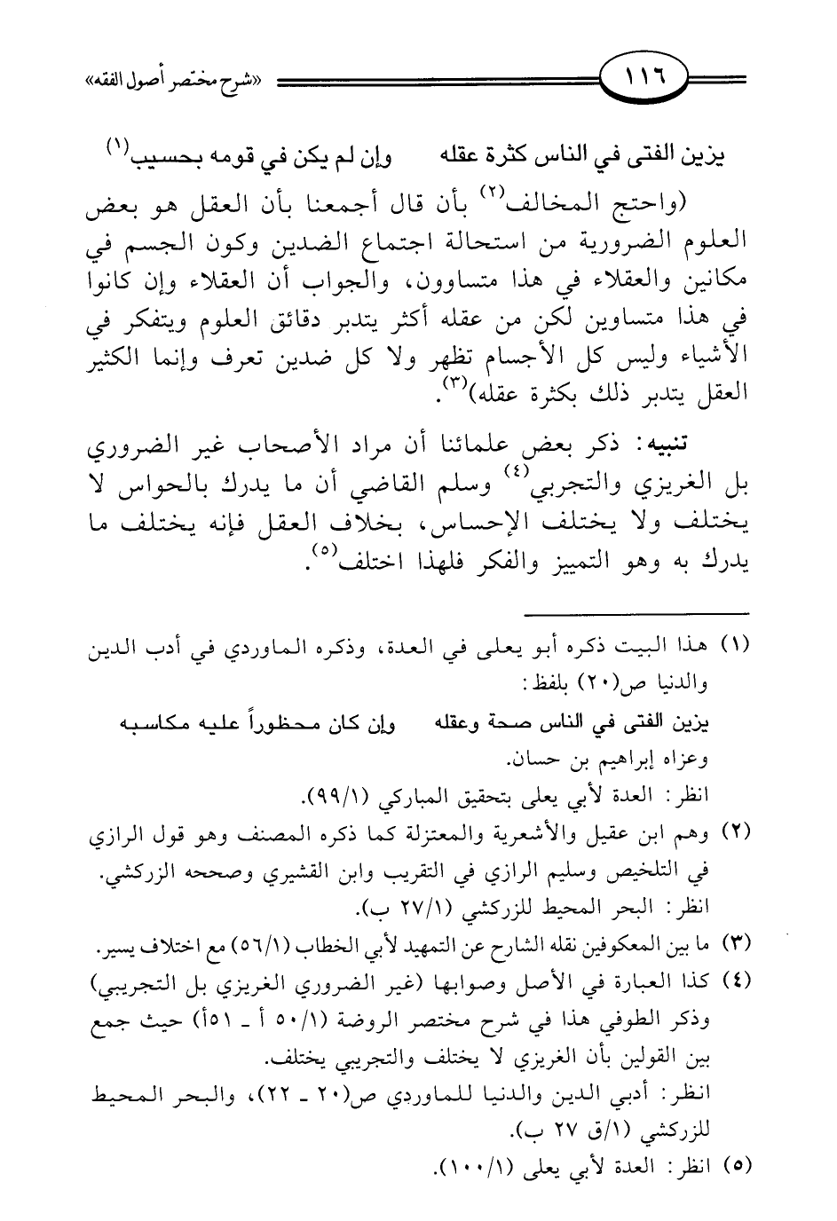 (واحتج المخالف (¬2) بأن قال أجمعنا بأن العقل هو بعض العلوم الضرورية من استحالة اجتماع الضدين وكون الجسم في مكانين والعقلاء في هذا متساوون، والجواب أن العقلاء وإن كانوا في هذا متساوين لكن من عقله أكثر يتدبر دقائق العلوم ويتفكر في الأشياء وليس كل الأجسام تظهر ولا كل ضدين تعرف وإنما الكثير العقل يتدبر ذلك بكثرة عقله) (¬3).