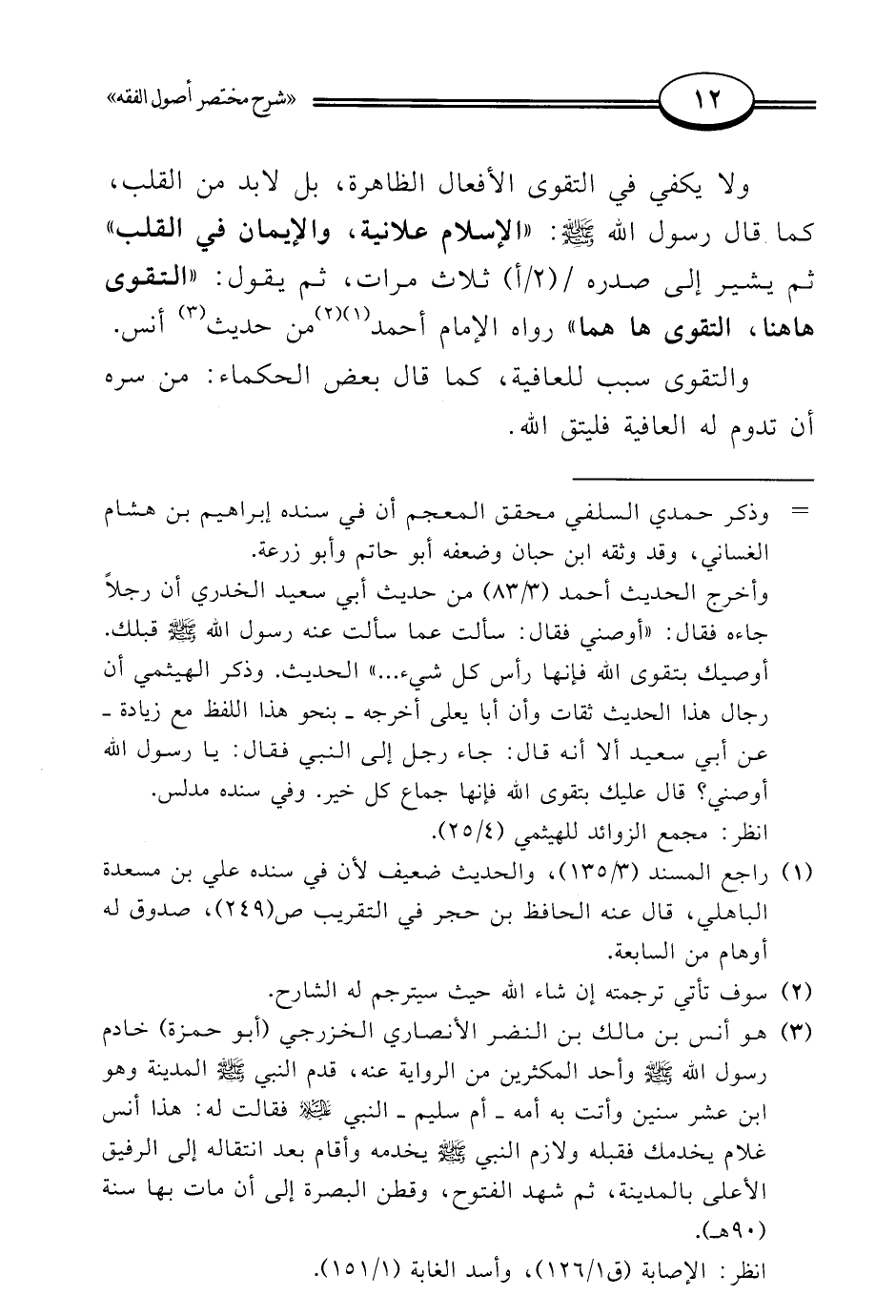 ولا يكفي في التقوى الأفعال الظاهرة، بل لا بد من القلب، كما قال رسول الله - صلى الله عليه وسلم -: "الإسلام علانية، والإيمان في القلب" ثم يشير إلى صدره ثلاث مرات، ثم يقول: "التقوى هاهنا، التقوى ها هما" رواه الإمام أحمد (¬1) (¬2) من حديث (¬3) أنس.