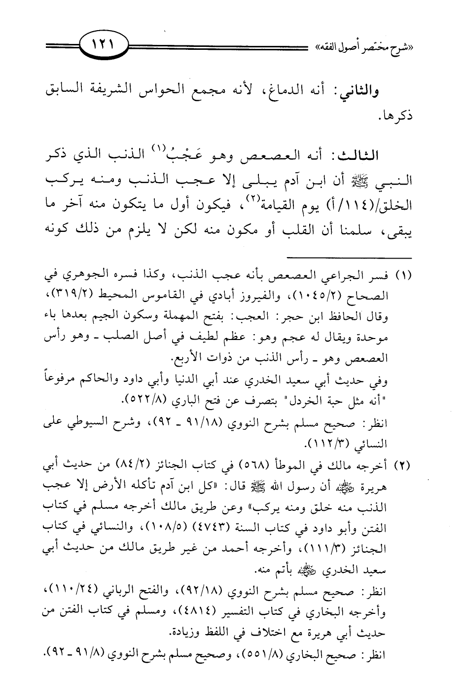 الثالث: أنه العصعص وهو عَجْبُ (¬1) الذنب الذي ذكر النبي - صلى الله عليه وسلم - أن ابن آدم يبلى إلا عجب الذنب ومنه يركب الخلق يوم القيامة (¬2)، فيكون أول ما يتكون منه آخر ما يبقى، سلمنا أن القلب أو مكون منه لكن لا يلزم من ذلك كونه