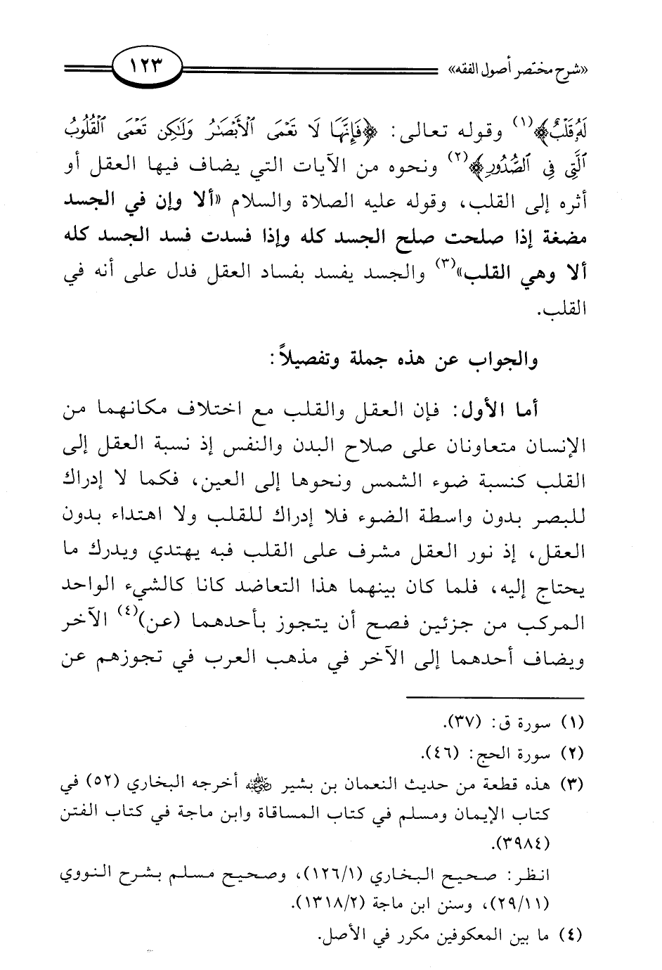 أما الأول: فإن العقل والقلب مع اختلاف مكانهما من الإنسان متعاونان على صلاح البدن والنفس إذ نسبة العقل إلى القلب كنسبة ضوء الشمس ونحوها إلى العين، فكما لا إدراك للبصر بدون واسطة الضوء فلا إدراك للقلب ولا اهتداء بدون العقل، إذ نور العقل مشرف على القلب فبه يهتدي ويدرك ما يحتاج إليه، فلما كان بينهما هذا التعاضد كانا كالشيء الواحد المركب من جزئين فصح أن يتجوز بأحدهما (عن) (¬4) الآخر ويضاف أحدهما إلى الآخر في مذهب العرب في تجوزهم عن