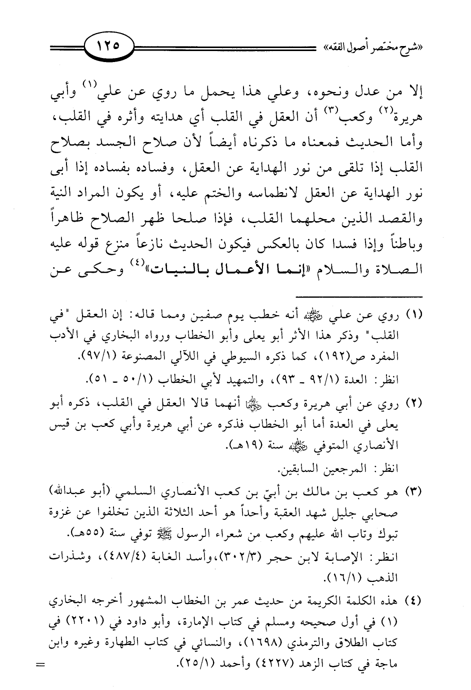 (¬1) روي عن علي - رضي الله عنه - أنه خطب يوم صفين ومما قاله: إن العقل "في القلب" وذكر هذا الأثر أبو يعلى وأبو الخطاب ورواه البخاري في الأدب المفرد ص (192)، كما ذكره السيوطي في اللآلي المصنوعة (1/ 97).