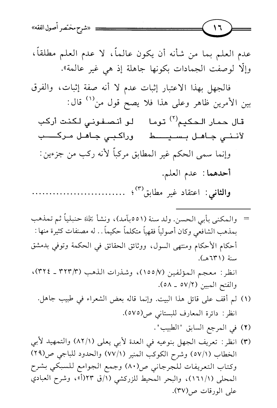(¬3) انظر: تعريف الجهل بنوعيه في العدة لأبي يعلى (1/ 82) والتمهيد لأبي الخطاب (1/ 57) وشرح الكوكب المنير (1/ 77) والحدود للباجي ص (29) وكتاب التعريفات للجرجاني ص (80) وجمع الجوامع للسبكي بشرح المحلى (1/ 161)، والبحر المحيط للزركشي (1 /ق 23 (أ"، وشرح العبادي على الورقات ص (37).