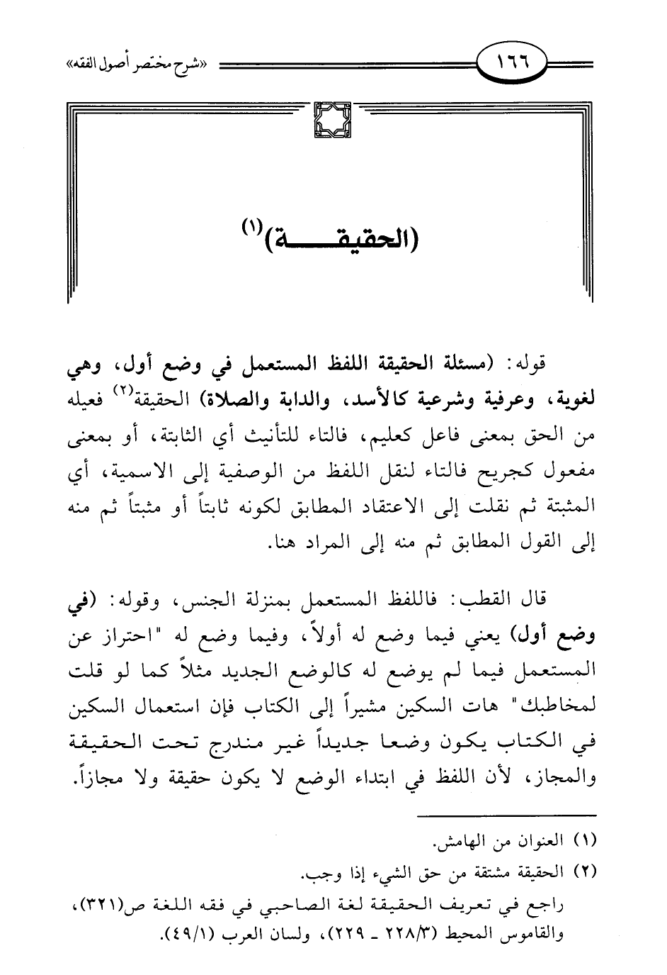 (¬2) الحقيقة مشتقة من حق الشيء إذا وجب.