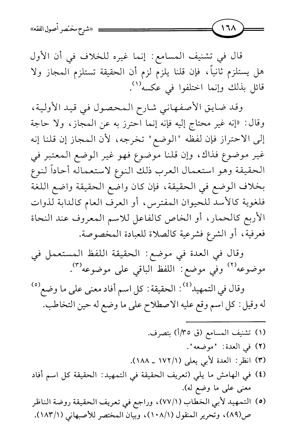 (¬5) التمهيد لأبي الخطاب (1/ 77)، وراجع في تعريف الحقيقة روضة الناظر ص (89)، وتحرير المنقول (1/ 108)، وبيان المختصر للأصبهاني (1/ 183).