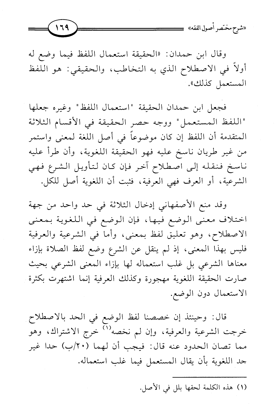 فجعل ابن حمدان الحقيقة "استعمال اللفظ" وغيره جعلها "اللفظ المستعمل" ووجه حصر الحقيقة في الأقسام الثلاثة المتقدمة أن اللفظ إن كان موضوعًا في أصل اللغة لمعنى واستمر من غير طريان ناسخ عليه فهو الحقيقة اللغوية، وأن طرأ عليه ناسخ فنقله إلى اصطلاح آخر فإن كان لتأويل الشرع فهي الشرعية، أو العرف فهي العرفية، فثبت أن اللغوية أصل للكل.