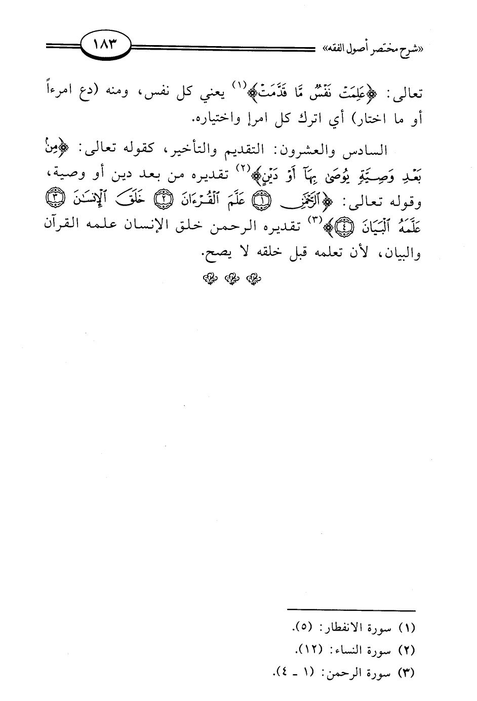 السادس والعشرون: التقديم والتأخير، كقوله تعالى: {مِنْ بَعْدِ وَصِيَّةٍ يُوصَى بِهَا أَوْ دَيْنٍ} (¬2) تقديره من بعد دين أو وصية، وقوله تعالى: {الرَّحْمَنُ (1) عَلَّمَ الْقُرْآنَ (2) خَلَقَ الْإِنْسَانَ (3) عَلَّمَهُ الْبَيَانَ (4)} (¬3) تقديره الرحمن خلق الإنسان علمه القرآن والبيان، لأن تعلمه قبل خلقه لا يصح.