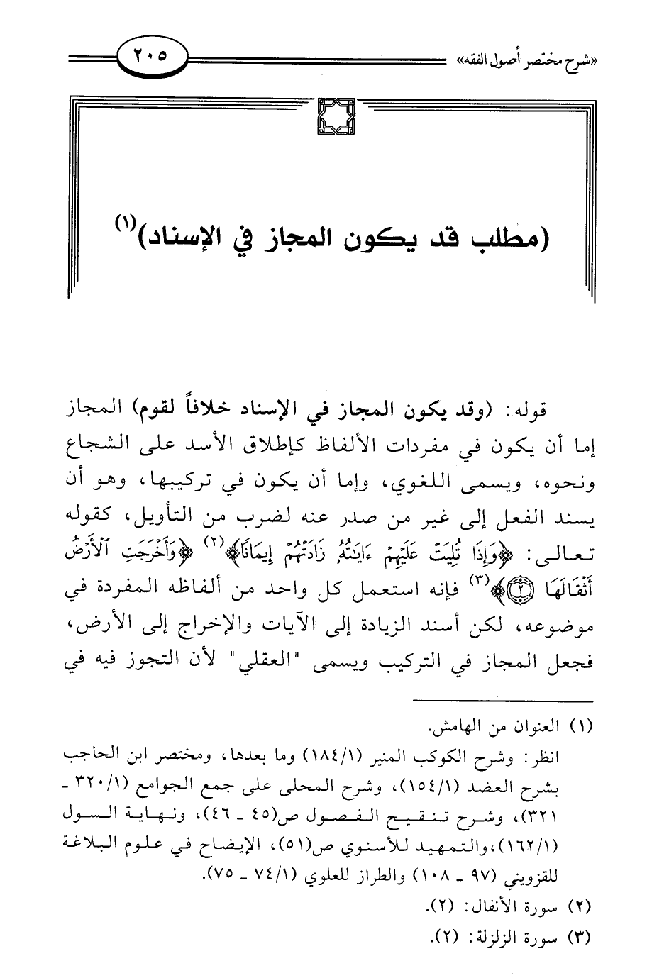 قوله: (وقد يكون المجاز في الإسناد خلافًا لقوم) المجاز إما أن يكون في مفردات الألفاظ كإطلاق الأسد على الشجاع ونحوه، ويسمى اللغوي، وإما أن يكون في تركيبها، وهو أن يسند الفعل إلى غير من صدر عنه لضرب من التأويل، كقوله تعالى: {وَإِذَا تُلِيَتْ عَلَيْهِمْ آيَاتُهُ زَادَتْهُمْ إِيمَانًا} (¬2) {وَأَخْرَجَتِ الْأَرْضُ أَثْقَالَهَا} (¬3) فإنه استعمل كل واحد من ألفاظه المفردة في موضوعه، لكن أسند الزيادة إلى الآيات والإخراج إلى الأرض، فجعل المجاز في التركيب ويسمى "العقلي" لأن التجوز فيه في