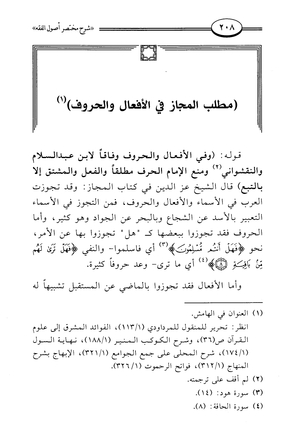 قوله: (وفي الأفعال والحروف وفاقًا لابن عبد السلام والنقشواني (¬2) ومنع الإمام الحرف مطلقًا والفعل والمشتق إلا بالتبع) قال الشيخ عز الدين في كتاب المجاز: وقد تجوزت العرب في الأسماء والأفعال والحروف، فمن التجوز في الأسماء التعبير بالأسد عن الشجاع وبالبحر عن الجواد وهو كثير، وأما الحروف فقد تجوزوا ببعضها كـ "هل" تجوزوا بها عن الأمر، نحو {فَهَلْ أَنْتُمْ مُسْلِمُونَ} (¬3) أي فأسلموا - والنفي {فَهَلْ تَرَى لَهُمْ مِنْ بَاقِيَةٍ (8)} (¬4) أي ما ترى - وعد حروفًا كثيرة.
