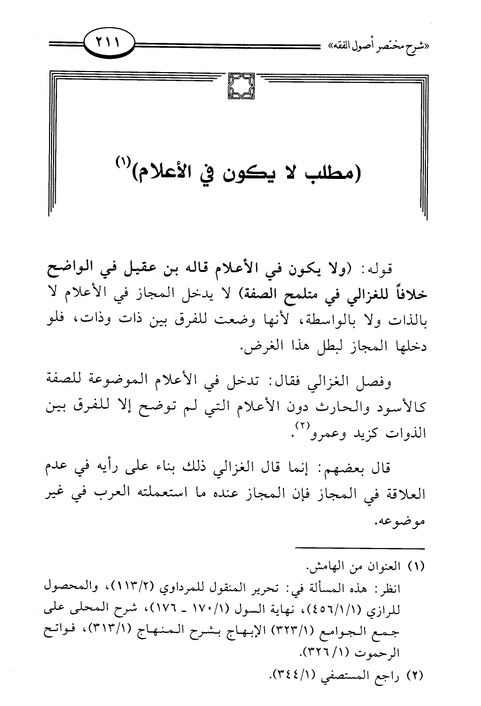 قوله: (ولا يكون في الأعلام قاله بن عقيل في الواضح خلافًا للغزالي في متلمح الصفة) لا يدخل المجاز في الأعلام لا بالذات ولا بالواسطة، لأنها وضعت للفرق بين ذات وذات، فلو دخلها المجاز لبطل هذا الغرض.
