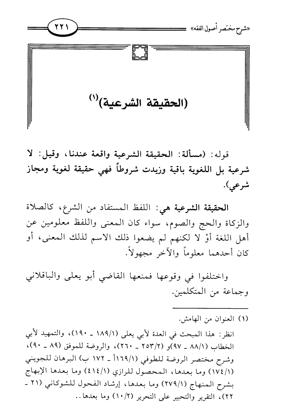 قوله: (مسألة: الحقيقة الشرعية واقعة عندنا، وقيل: لا شرعية بل اللغوية باقية وزيدت شروطًا فهي حقيقة لغوية ومجاز شرعي).