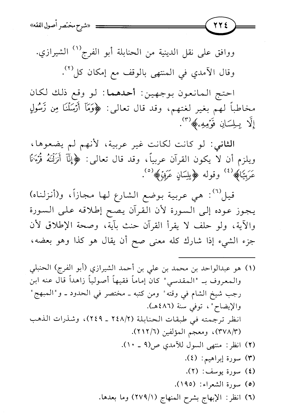 (¬1) هو عبد الواحد بن محمد بن علي بن أحمد الشيرازي (أبو الفرج) الحنبلي والمعروف بـ "المقدسي" كان إمامًا فقيهًا أصوليا زاهدًا قال عنه ابن رجب شيخ الشام في وقته" ومن كتبه - مختصر في الحدود - و"المبهج" والإيضاح"، توفي سنة (486 هـ).
