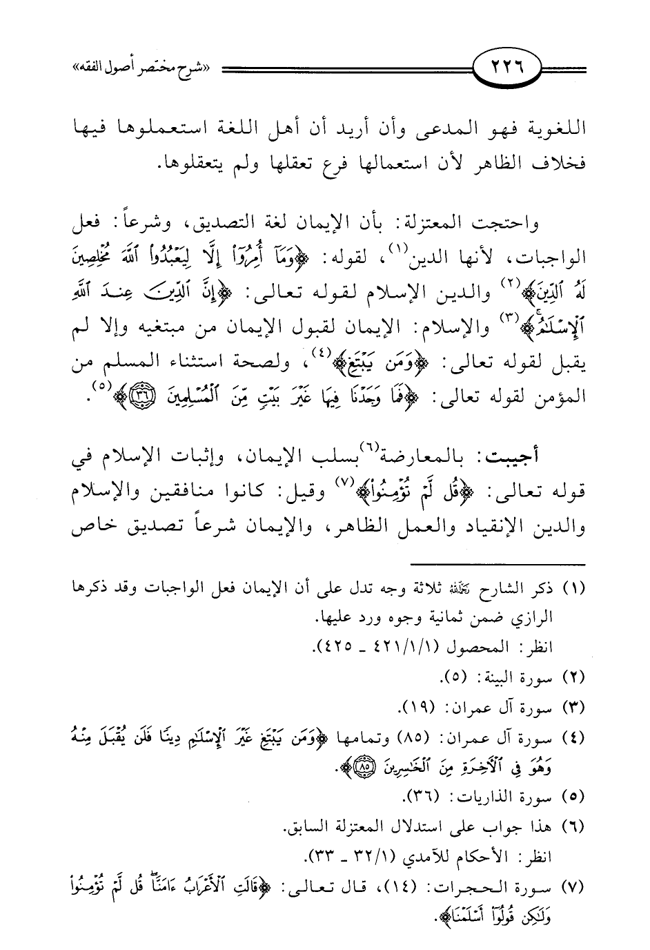 واحتجت المعتزلة: بأن الإيمان لغة التصديق، وشرعًا: فعل الواجبات، لأنها الدين (¬1)، لقوله: {وَمَا أُمِرُوا إِلَّا لِيَعْبُدُوا اللَّهَ مُخْلِصِينَ لَهُ الدِّينَ} (¬2) والدين الإسلام لقوله تعالى: {إِنَّ الدِّينَ عِنْدَ اللَّهِ الْإِسْلَامُ} (¬3) والإسلام: الإيمان لقبول الإيمان من مبتغيه وإلا لم يقبل لقوله تعالى: {وَمَنْ يَبْتَغِ} (¬4)، ولصحة استثناء المسلم من المؤمن لقوله تعالى: {فَمَا وَجَدْنَا فِيهَا غَيْرَ بَيْتٍ مِنَ الْمُسْلِمِينَ (36)} (¬5).