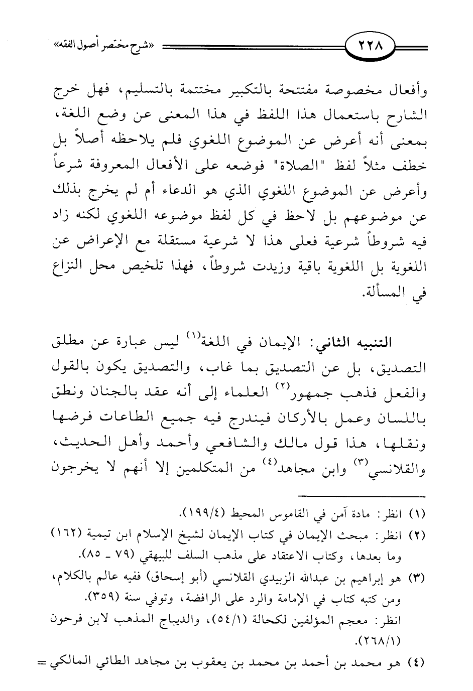 التنبيه الثاني: الإيمان في اللغة (¬1) ليس عبارة عن مطلق التصديق، بل عن التصديق بما غاب، والتصديق يكون بالقول والفعل فذهب جمهور (¬2) العلماء إلى أنه عقد بالجنان ونطق باللسان وعمل بالأركان فيندرج فيه جميع الطاعات فرضها ونقلها، هذا قول مالك والشافعي وأحمد وأهل الحديث، والقلانسي (¬3) وابن مجاهد (¬4) من المتكلمين إلا أنهم لا يخرجون