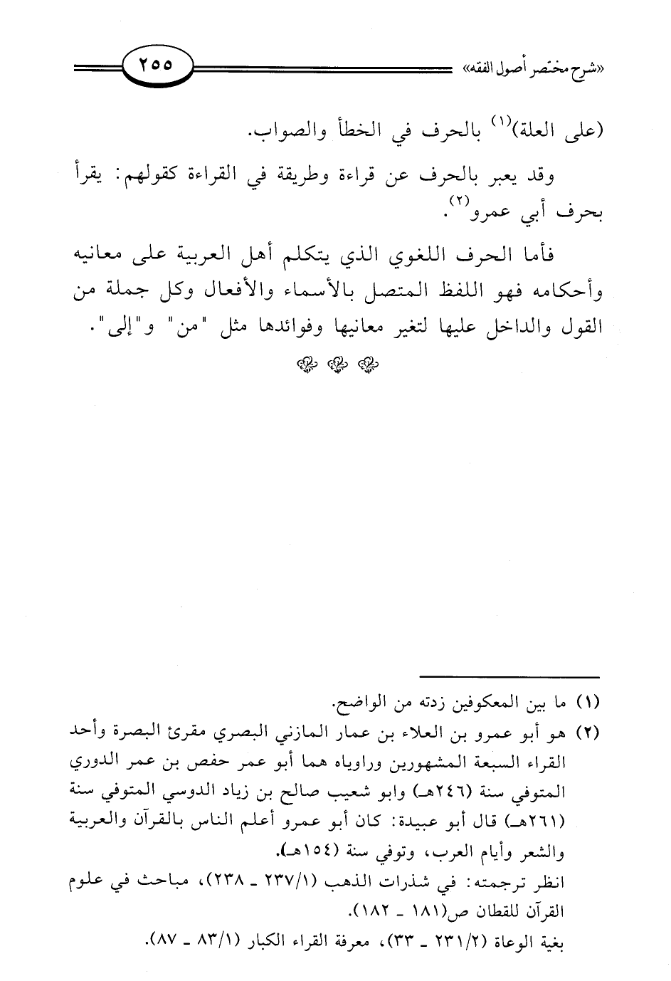 (¬2) هو أبو عمرو بن العلاء بن عمار المازني البصري مقرئ البصرة وأحد القراء السبعة المشهورين وراوياه هما أبو عمر حفص بن عمر الدوري المتوفي سنة (246 هـ) وأبو شعيب صالح بن زياد الدوسي المتوفي سنة (261 هـ) قال أبو عبيدة: كان أبو عمرو أعلم الناس بالقرآن والعربية والشعر وأيام العرب، وتوفي سنة (154 هـ).