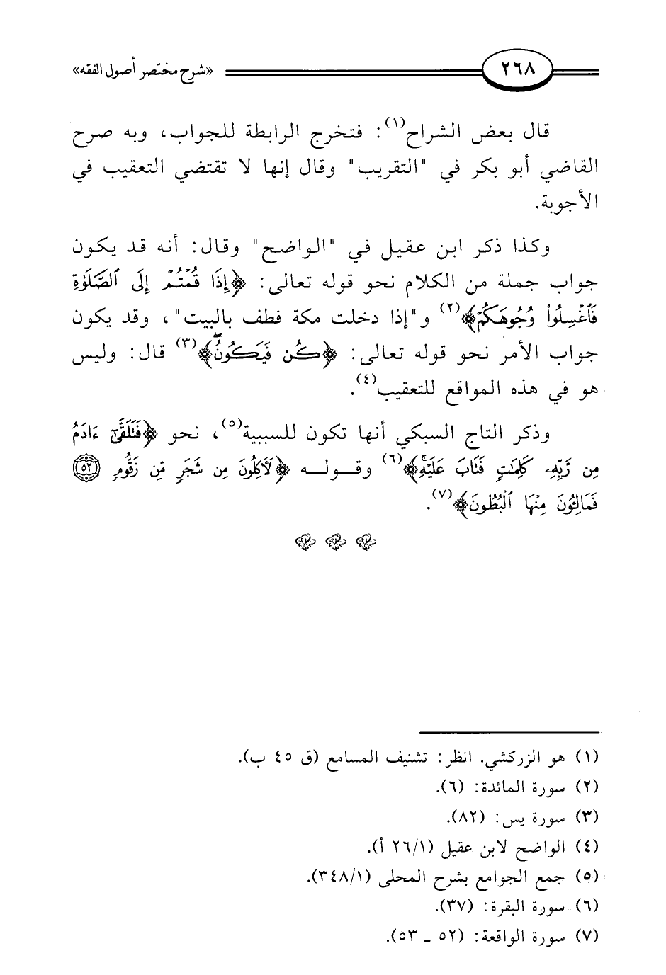 قال بعض الشراح (¬1): فتخرج الرابطة للجواب، وبه صرح القاضي أبو بكر في "التقريب" وقال إنها لا تقتضي التعقيب في الأجوبة.