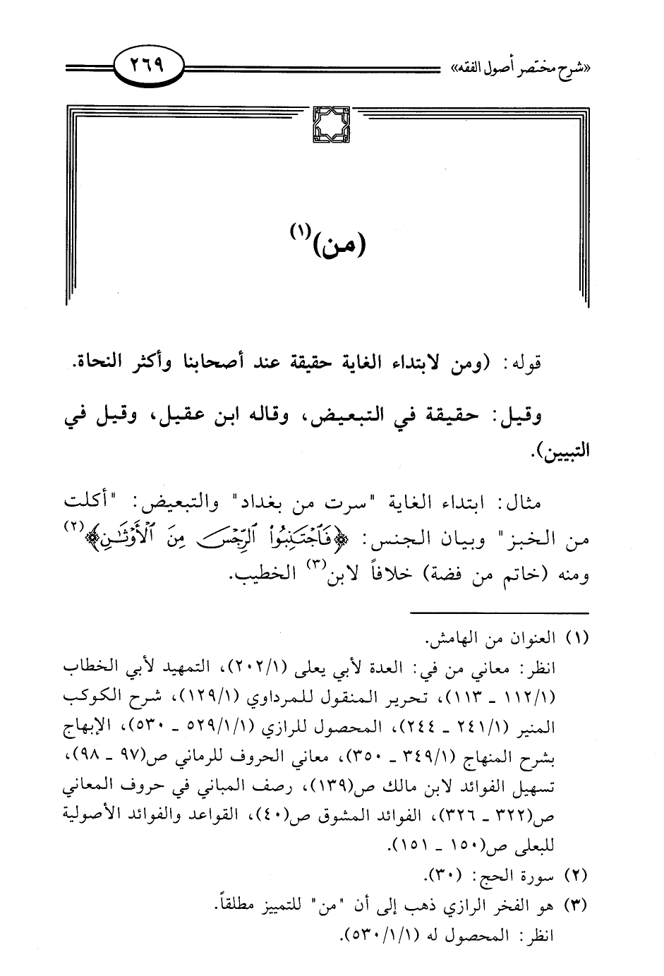مثال: ابتداء الغاية "سرت من بغداد" والتبعيض: "أكلت من الخبز" وبيان الجنس: {فَاجْتَنِبُوا الرِّجْسَ مِنَ الْأَوْثَانِ} (¬2) ومنه (خاتم من فضة) خلافًا لابن (¬3) الخطيب.