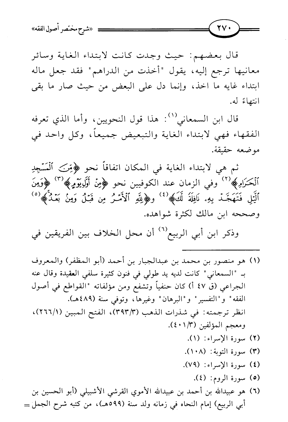 (¬1) هو منصور بن محمد بن عبد الجبار بن أحمد (أبو المظفر) والمعروف بـ "السمعاني" كانت لديه يد طولى في فنون كثيرة سلفي العقيدة وقال عنه الجراعي كان حنفيًّا وتشفع ومن مؤلفاته "القواطع في أصول الفقه" و "التفسير" و "البرهان" وغيرها، وتوفي سنة (489 هـ).