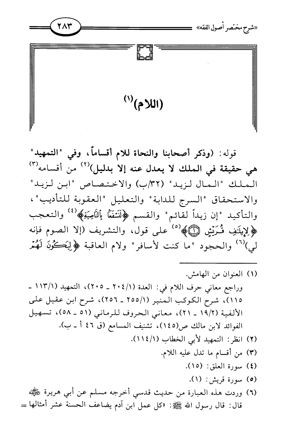 وراجع معاني حرف اللام في: العدة (1/ 204 - 205)، التمهيد (1/ 113 - 115)، شرح الكوكب المنير (1/ 255 - 256)، شرح ابن عقيل على الألفية (2/ 19 - 21)، معاني الحروف للرماني (51 - 58)، تسهيل الفوائد لابن مالك ص (145)، تشنيف المسامع (ق 46 أ- ب).