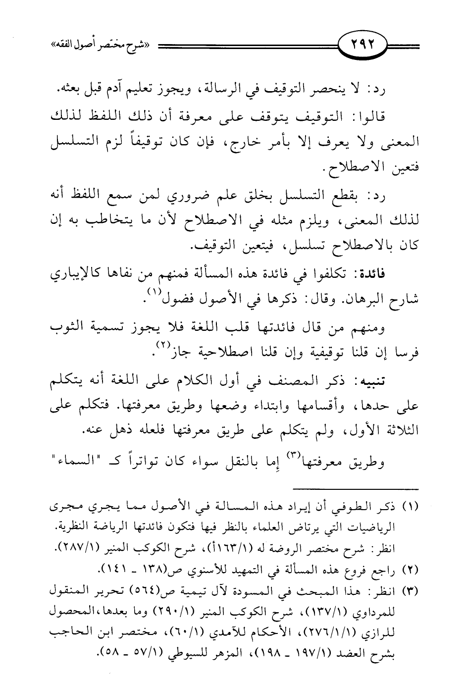 (¬3) انظر: هذا المبحث في المسودة لآل تيمية ص (564) تحرير المنقول للمرداوي (1/ 137)، شرح الكوكب المنير (1/ 290) وما بعدها، المحصول للرازي (1/ 1/ 276)، الأحكام للآمدي (1/ 60)، مختصر ابن الحاجب بشرح العضد (1/ 197 - 198)، المزهر للسيوطي (1/ 57 - 58).