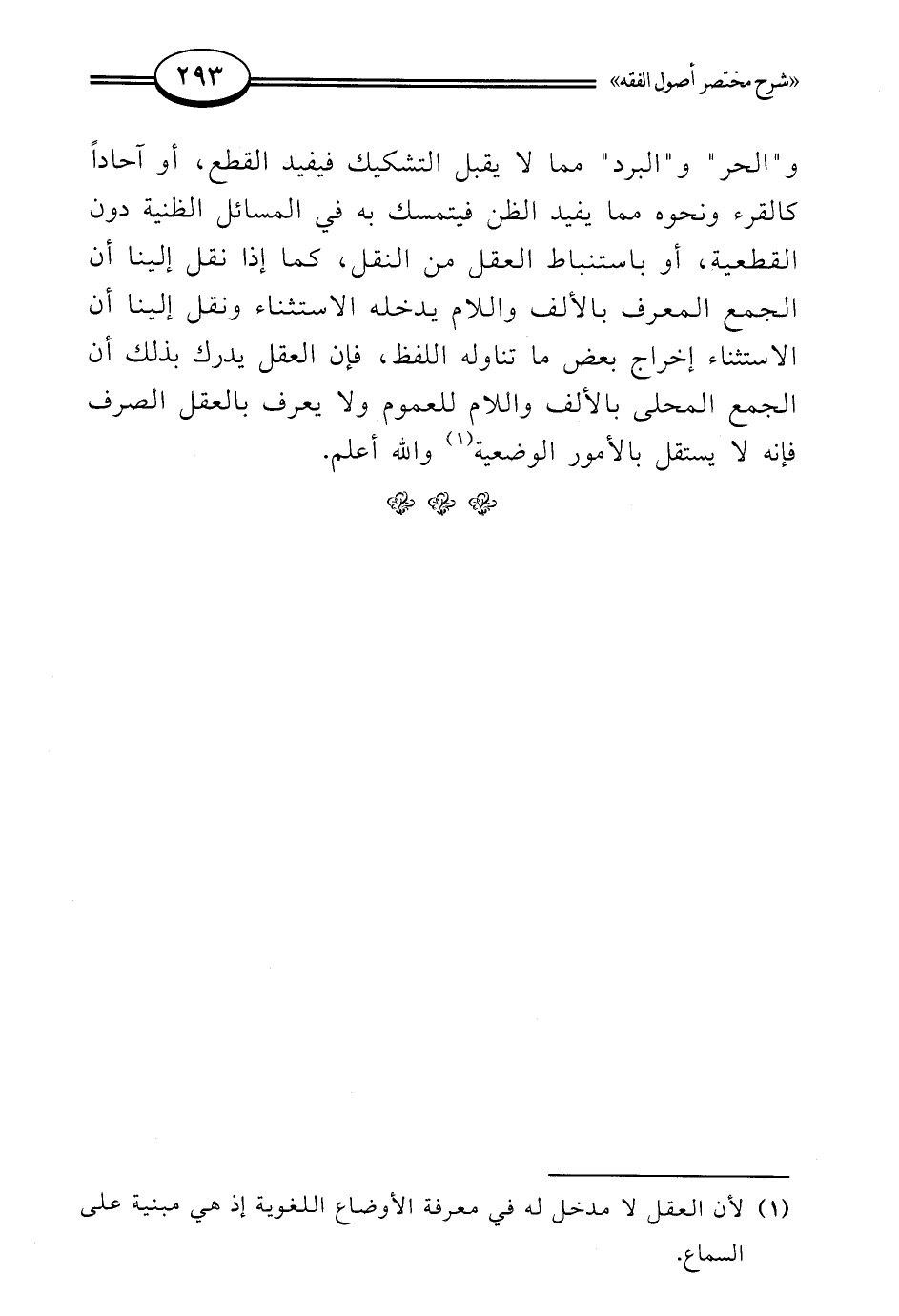 و"الحر" و "البرد" مما لا يقبل التشكيك فيفيد القطع، أو آحادًا كالقرء ونحوه مما يفيد الظن فيتمسك به في المسائل الظنية دون القطعية، أو باستنباط العقل من النقل، كما إذا نقل إلينا أن الجمع المعرف بالألف واللام يدخله الاستثناء ونقل إلينا أن الاستثناء إخراج بعض ما تناوله اللفظ، فإن العقل يدرك بذلك أن الجمع المحلى بالألف واللام للعموم ولا يعرف بالعقل الصرف فإنه لا يستقل بالأمور الوضعية (¬1) والله أعلم.