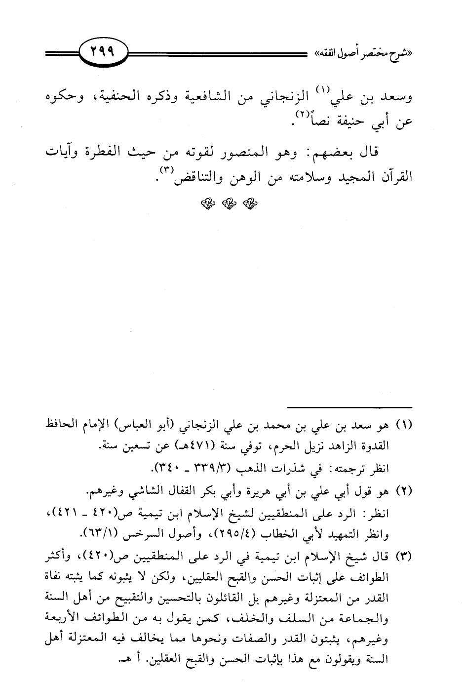 (¬3) قال شيخ الإسلام ابن تيمية في الرد على المنطقيين ص (420)، وأكثر الطوائف على إثبات الحسن والقبح العقليين، ولكن لا يثبونه كما يثبته نفاة القدر من المعتزلة وغيرهم بل القائلون بالتحسين والتقبيح من أهل السنة والجماعة من السلف والخلف، كمن يقول به من الطوائف الأربعة وغيرهم، يثبتون القدر والصفات ونحوها مما يخالف فيه المعتزلة أهل السنة ويقولون مع هذا بإثبات الحسن والقبح العقلين. أهـ.
