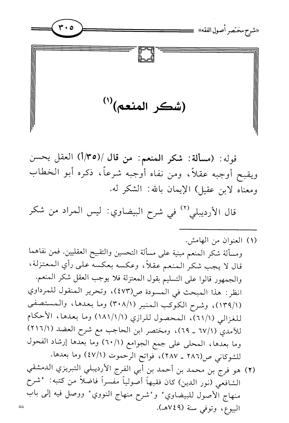 (¬2) هو فرج بن محمد بن أحمد بن أبي الفرج الأرديبلي التبريزي الدمشقي الشافعي (نور الدين) كان فقيهًا أصوليًّا مفسرًا فاضلًا من كتبه: "شرح منهاج الأصول للبيضاوي" و "شرح منهاج النووي" ووصل فيه إلى باب البيوع، وتوفي سنة (749 هـ). =