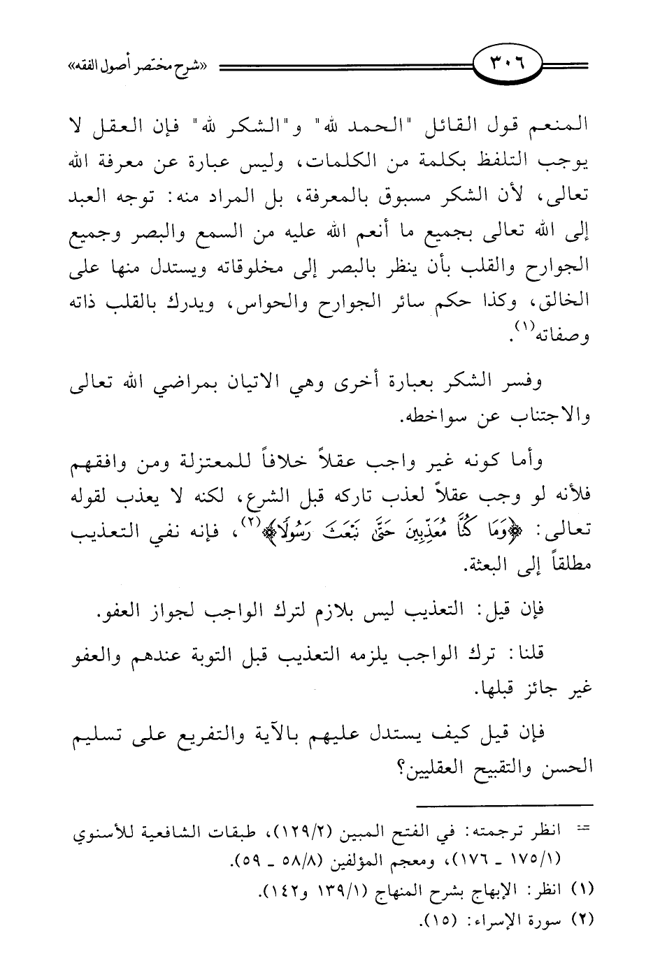 المنعم قول القائل "الحمد لله" و "الشكر لله" فإن العقل لا يوجب التلفظ بكلمة من الكلمات، وليس عبارة عن معرفة الله تعالى، لأن الشكر مسبوق بالمعرفة، بل المراد منه: توجه العبد إلى الله تعالى بجميع ما أنعم الله عليه من السمع والبصر وجميع الجوارح والقلب بأن ينظر بالبصر إلى مخلوقاته ويستدل منها على الخالق، وكذا حكم سائر الجوارح والحواس، ويدرك بالقلب ذاته وصفاته (¬1).