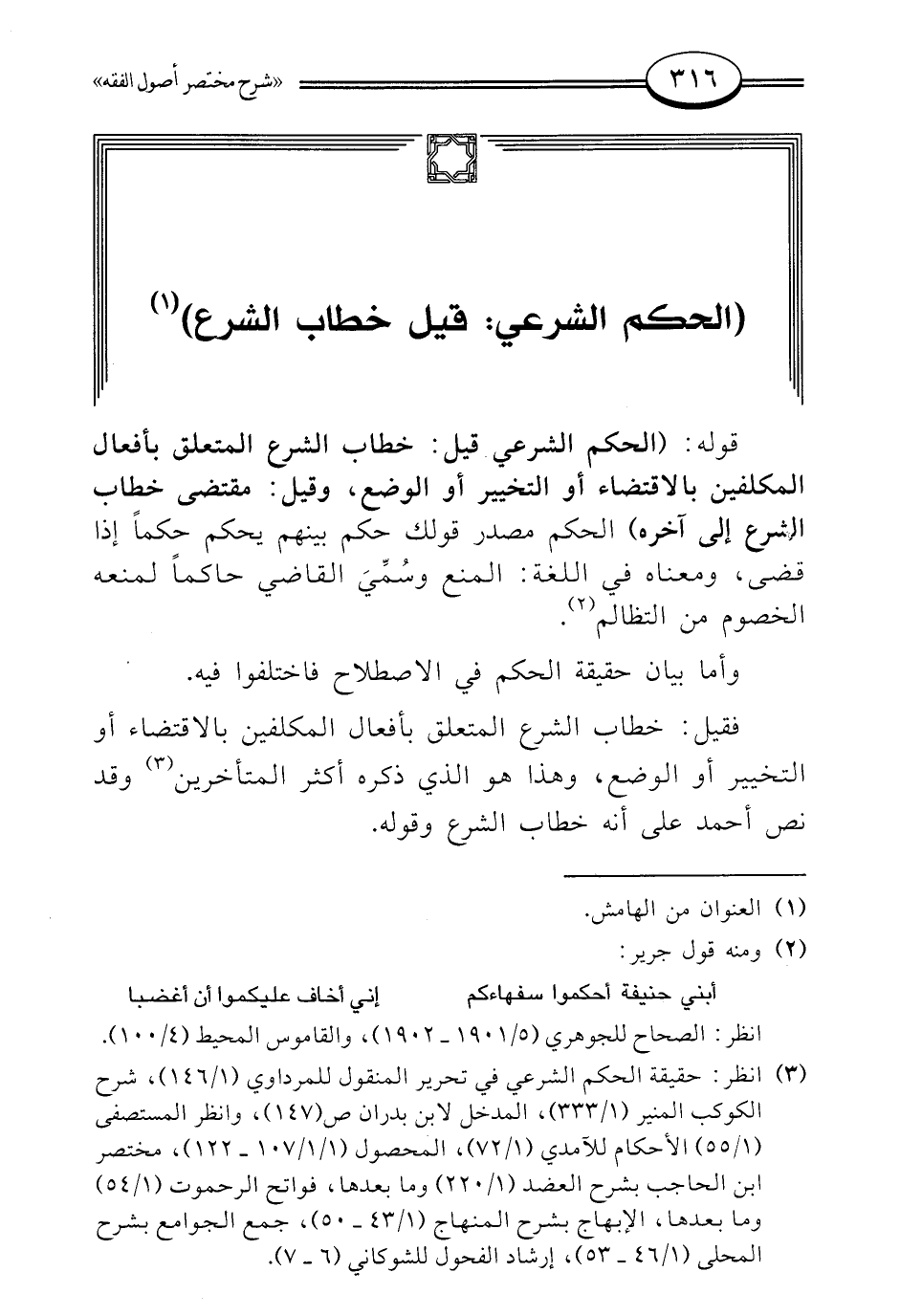 (¬3) انظر: حقيقة الحكم الشرعي في تحرير المنقول للمرداوي (1/ 146)، شرح الكوكب المنير (1/ 333)، المدخل لابن بدران ص (147)، وانظر المستصفى (1/ 55) الأحكام للآمدي (1/ 72)، المحصول (1/ 1/ 107 - 122)، مختصر ابن الحاجب بشرح العضد (1/ 220) وما بعدها، فواتح الرحموت (1/ 54) وما بعدها، الإبهاج بشرح المنهاج (1/ 43 - 50)، جمع الجوامع بشرح المحلى (1/ 46 - 53)، إرشاد الفحول للشوكاني (6 - 7).