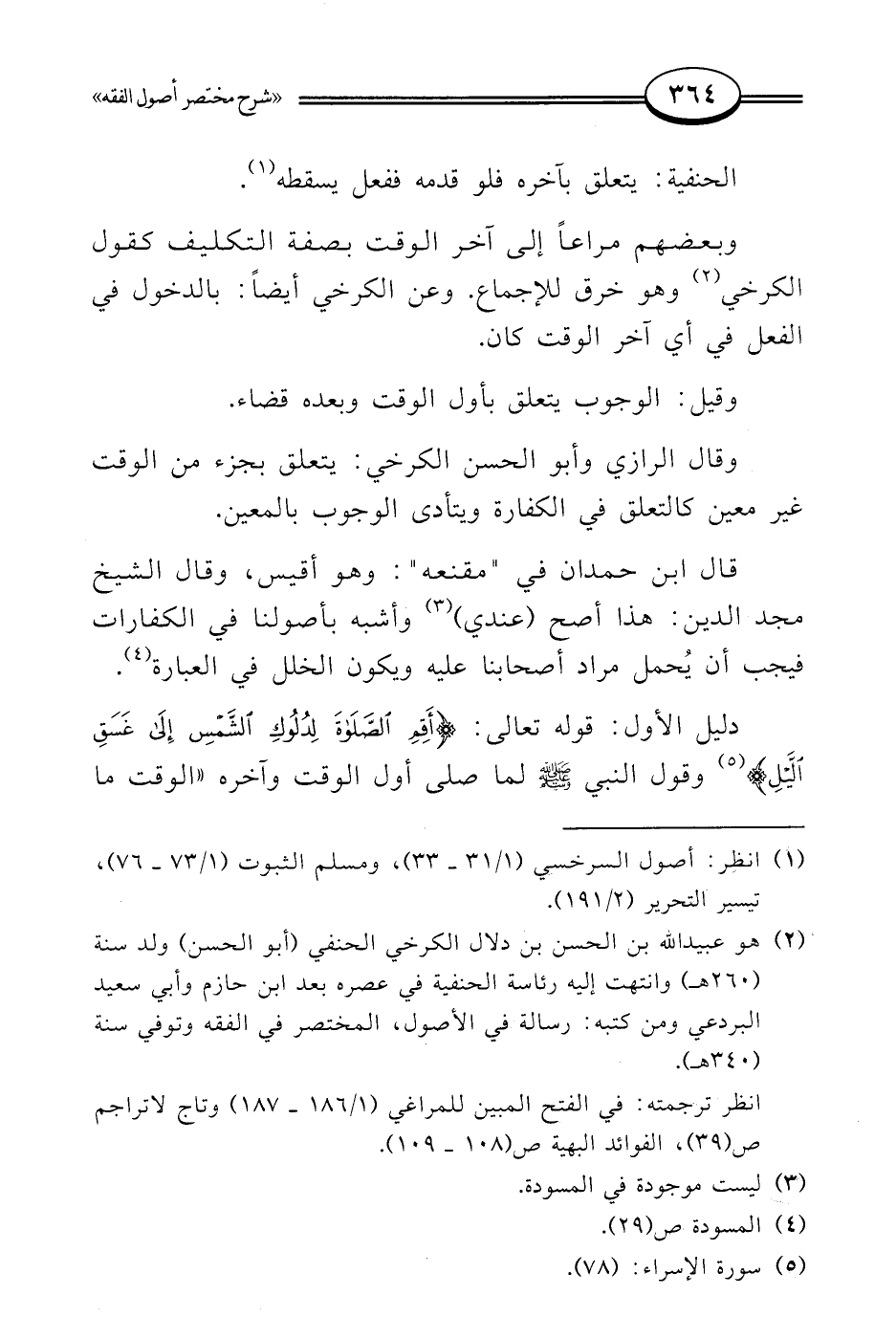 (¬2) هو عبيد الله بن الحسن بن دلال الكرخي الحنفي (أبو الحسن) ولد سنة (260 هـ) وانتهت إليه رئاسة الحنفية في عصره بعد ابن حازم وأبي سعيد البردعي ومن كتبه: رسالة في الأصول، المختصر في الفقه وتوفي سنة (340 هـ).