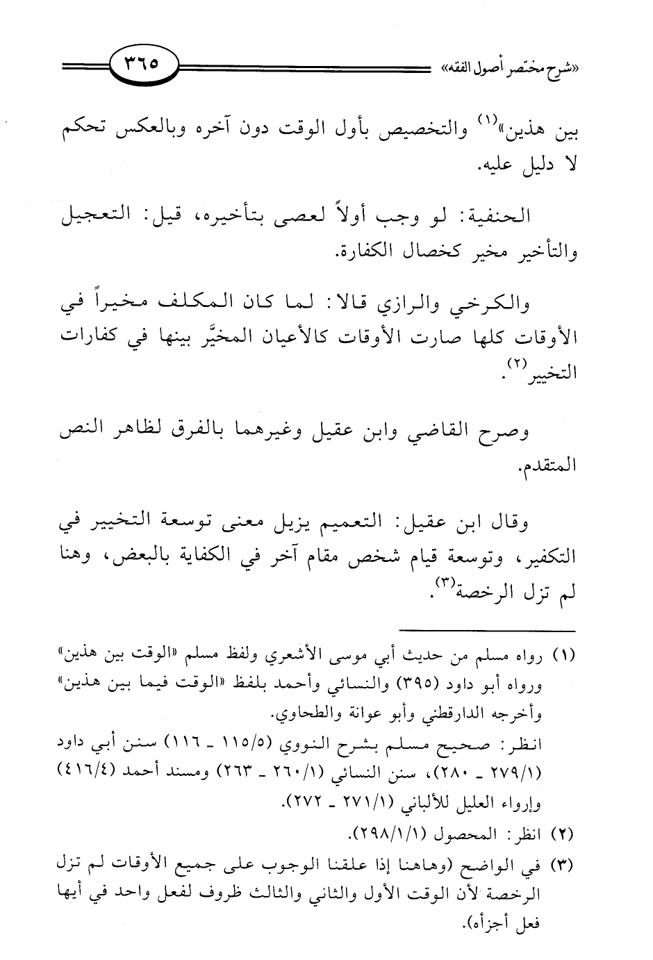 (¬3) في الواضح (وهاهنا إذا علقنا الوجوب على جميع الأوقات لم تزل الرخصة لأن الوقت الأول والثاني والثالث ظروف لفعل واحد في أيها فعل أجزأه).
