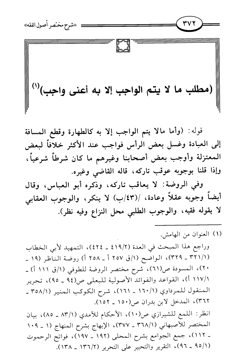 قوله: (وأما ما لا يتم الواجب إلا به كالطهارة وقطع المسافة إلى العبادة وغسل بعض الرأس فواجب عند الأكثر خلافًا لبعض المعتزلة وأوجب بعض أصحابنا وغيرهم ما كان شرطًا شرعيًّا، وإذا قلنا بوجوبه عوقب تاركه، قاله القاضي وغيره.