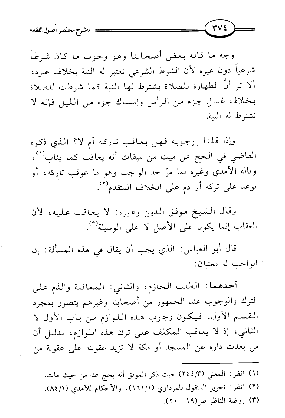 أحدهما: الطلب الجازم، والثاني: المعاقبة والذم على الترك والوجوب عند الجمهور من أصحابنا وغيرهم يتصور بمجرد القسم الأول، فيكون وجوب هذه اللوازم من باب الأول لا الثاني، إذ لا يعاقب المكلف على ترك هذه اللوازم، بدليل أن من بعدت داره عن المسجد أو مكة لا تزيد عقوبته على عقوبة من