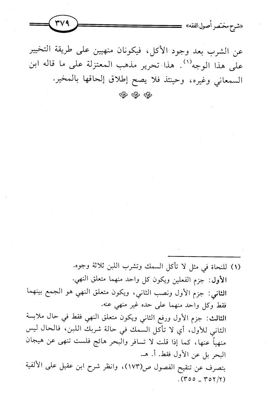 (¬1) للنحاة في مثل لا تأكل السمك وتشرب اللبن ثلاثة وجوه.