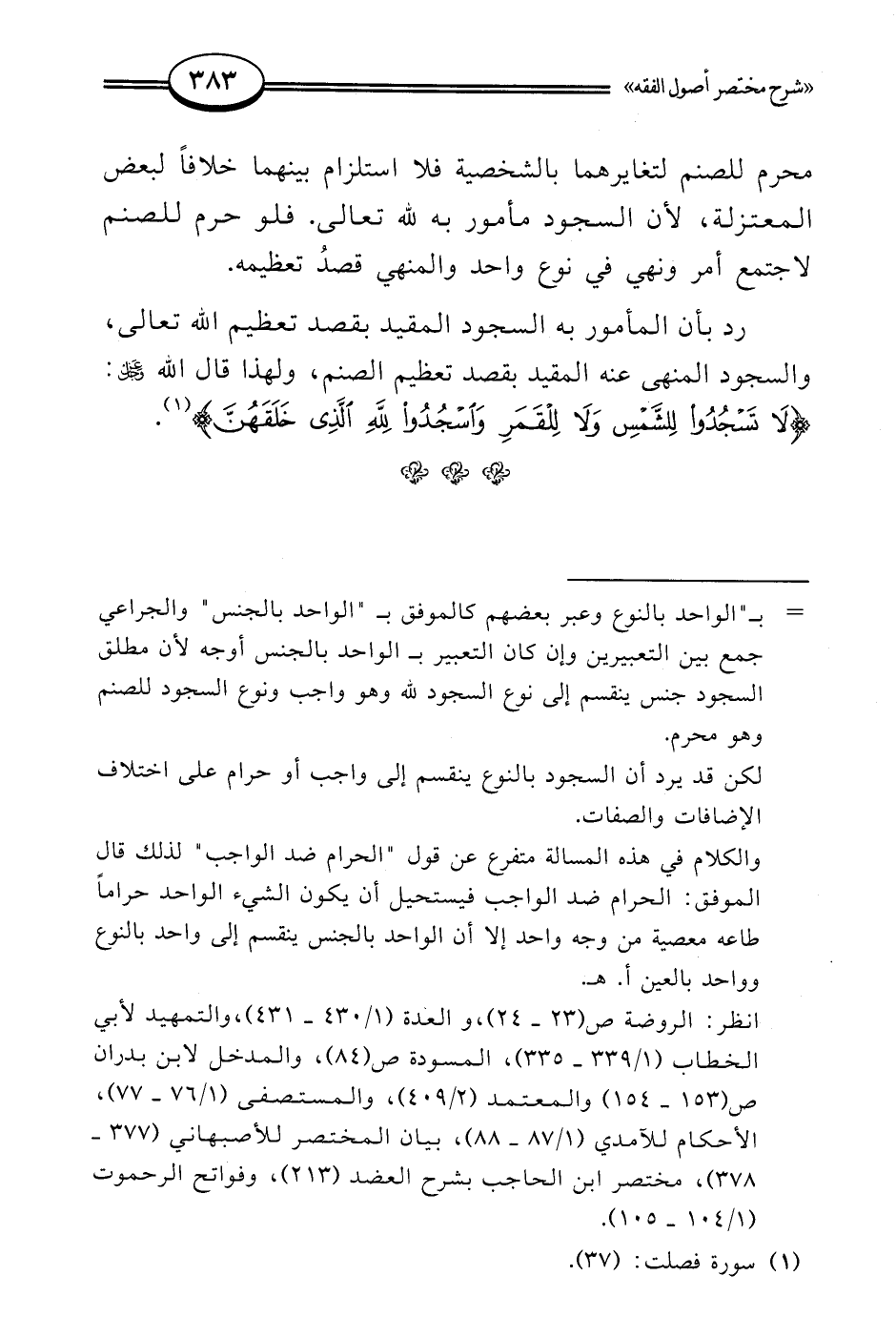 = بـ "الواحد بالنوع وعبر بعضهم كالموفق بـ "الواحد بالجنس" والجراعي جمع بين التعبيرين وإن كان التعبير بـ الواحد بالجنس أوجه لأن مطلق السجود جنس ينقسم إلى نوع السجود لله وهو واجب ونوع السجود للصنم وهو محرم.