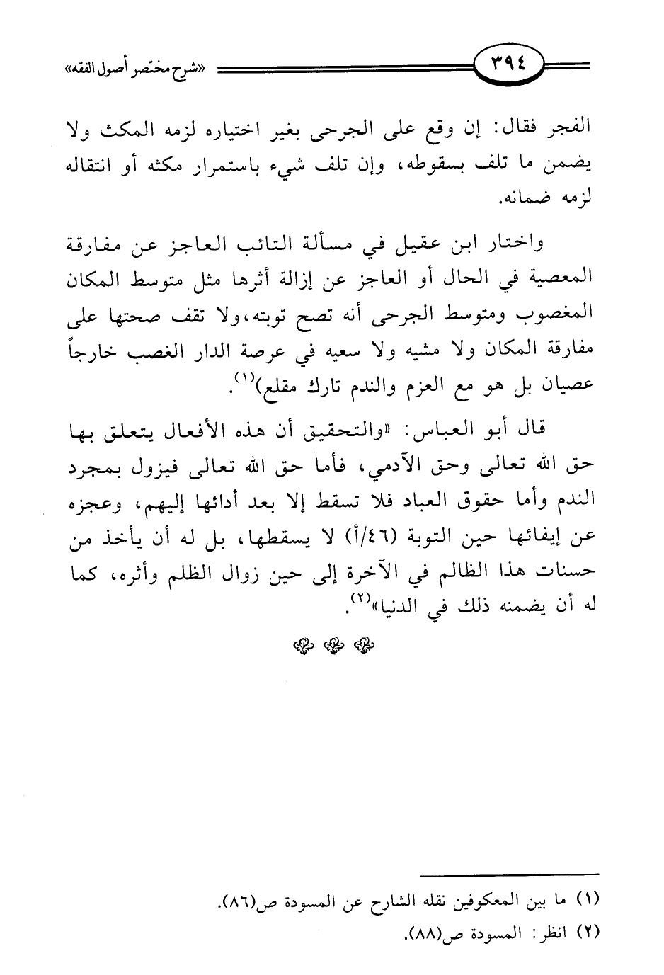 قال أبو العباس: "والتحقيق أن هذه الأفعال يتعلق بها حق الله تعالى وحق الآدمي، فأما حق الله تعالى فيزول بمجرد الندم وأما حقوق العباد فلا تسقط إلا بعد أدائها إليهم، وعجزه عن إيفائها حين التوبة لا يسقطها، بل له أن يأخذ من حسنات هذا الظالم في الآخرة إلى حين زوال الظلم وأثره، كما له أن يضمنه ذلك في الدنيا" (¬2).