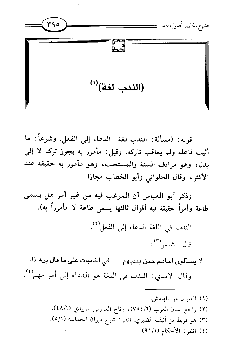وقال الآمدي: الندب في اللغة هو الدعاء إلى أمر مهم (¬4).