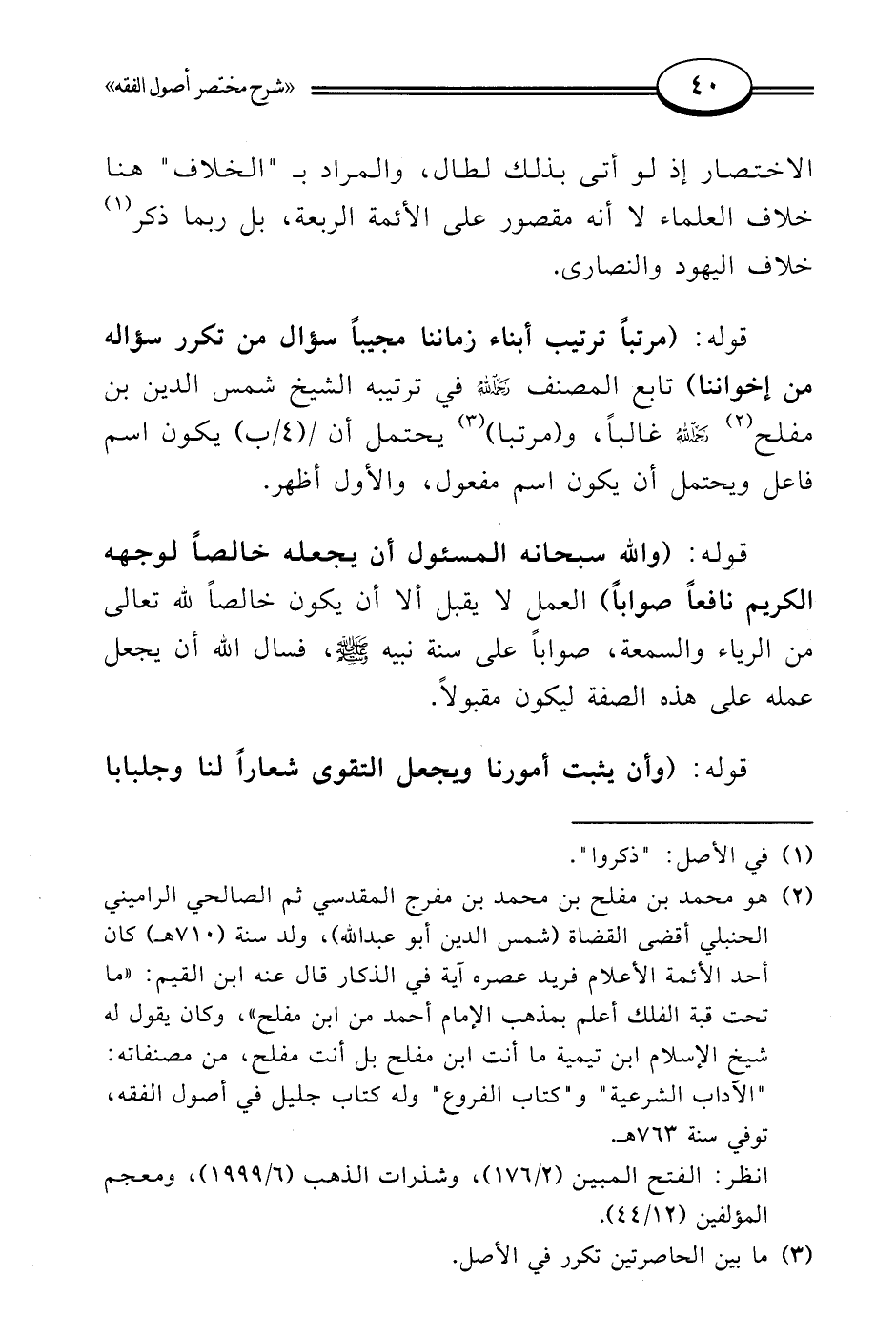 (¬2) هو محمد بن مفلح بن محمد بن مفرج المقدسي ثم الصالحي الراميني الحنبلي أقضى القضاة (شمس الدين أبو عبد الله)، ولد سنة (710 هـ) كان أحد الأئمة الأعلام فريد عصره آية في الذكار قال عنه ابن القيم: "ما تحت قبة الفلك أعلم بمذهب الإمام أحمد من ابن مفلح"، وكان يقول له شيخ الإسلام ابن تيمية ما أنت ابن مفلح بل أنت مفلح، من مصنفاته: "الآداب الشرعية" و"كتاب الفروع" وله كتاب جليل في أصول الفقه، توفي سنة 763 هـ.