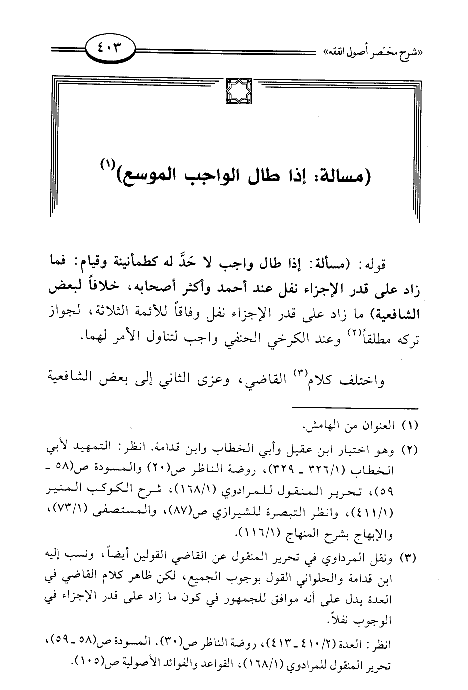 (¬3) ونقل المرداوي في تحرير المنقول عن القاضي القولين أيضًا، ونسب إليه ابن قدامة والحلواني القول بوجوب الجميع، لكن ظاهر كلام القاضي في العدة يدل على أنه موافق للجمهور في كون ما زاد على قدر الإجزاء في الوجوب نفلا.
