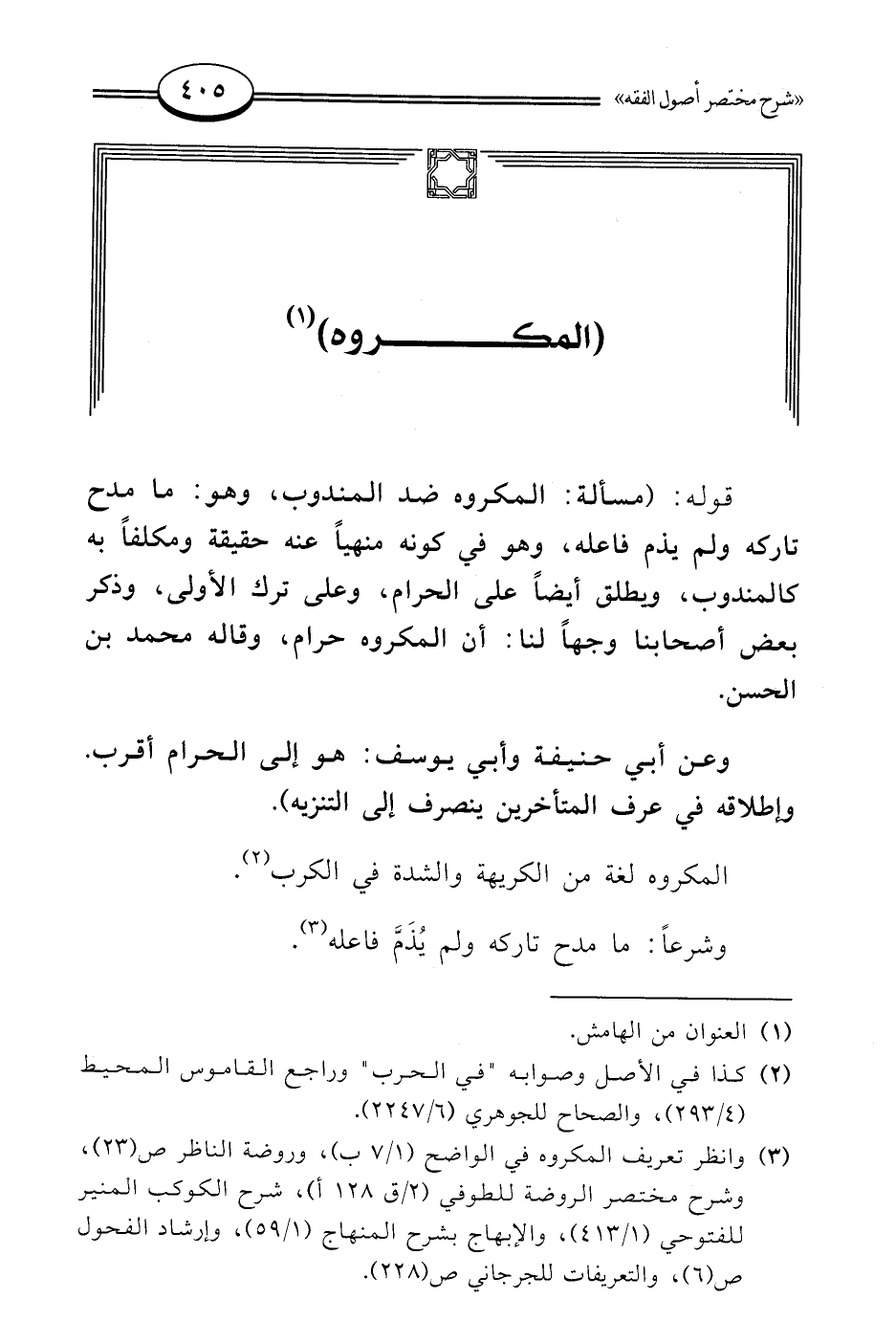 (¬3) وانظر تعريف المكروه في الواضح (1/ 7 ب)، وروضة الناظر ص (23)، وشرح مختصر الروضة للطوفي (2 / ق 128 أ)، شرح الكوكب المنير للفتوحي (1/ 413)، والإبهاج بشرح المنهاج (1/ 59)، وإرشاد الفحول ص (6)، والتعريفات للجرجاني ص (228).