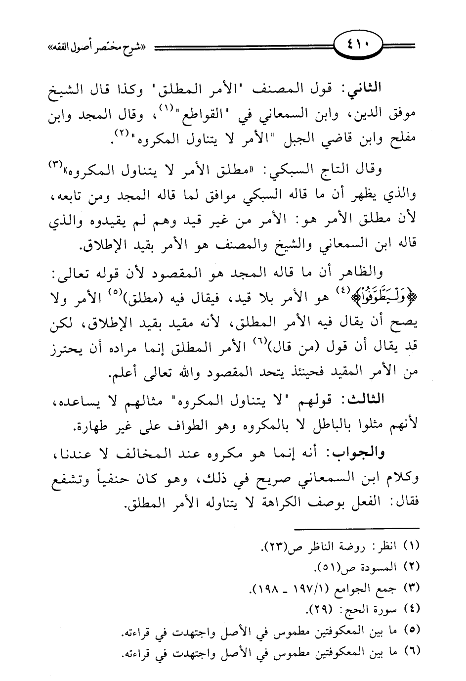 والظاهر أن ما قاله المجد هو المقصود لأن قوله تعالى: {وَلْيَطَّوَّفُوا} (¬4) هو الأمر بلا قيد، فيقال فيه (مطلق) (¬5) الأمر ولا يصح أن يقال فيه الأمر المطلق, لأنه مقيد بقيد الإطلاق، لكن قد يقال أن قول (من قال) (¬6) الأمر المطلق إنما مراده أن يحترز من الأمر المقيد فحينئذ يتحد المقصود والله تعالى أعلم.
