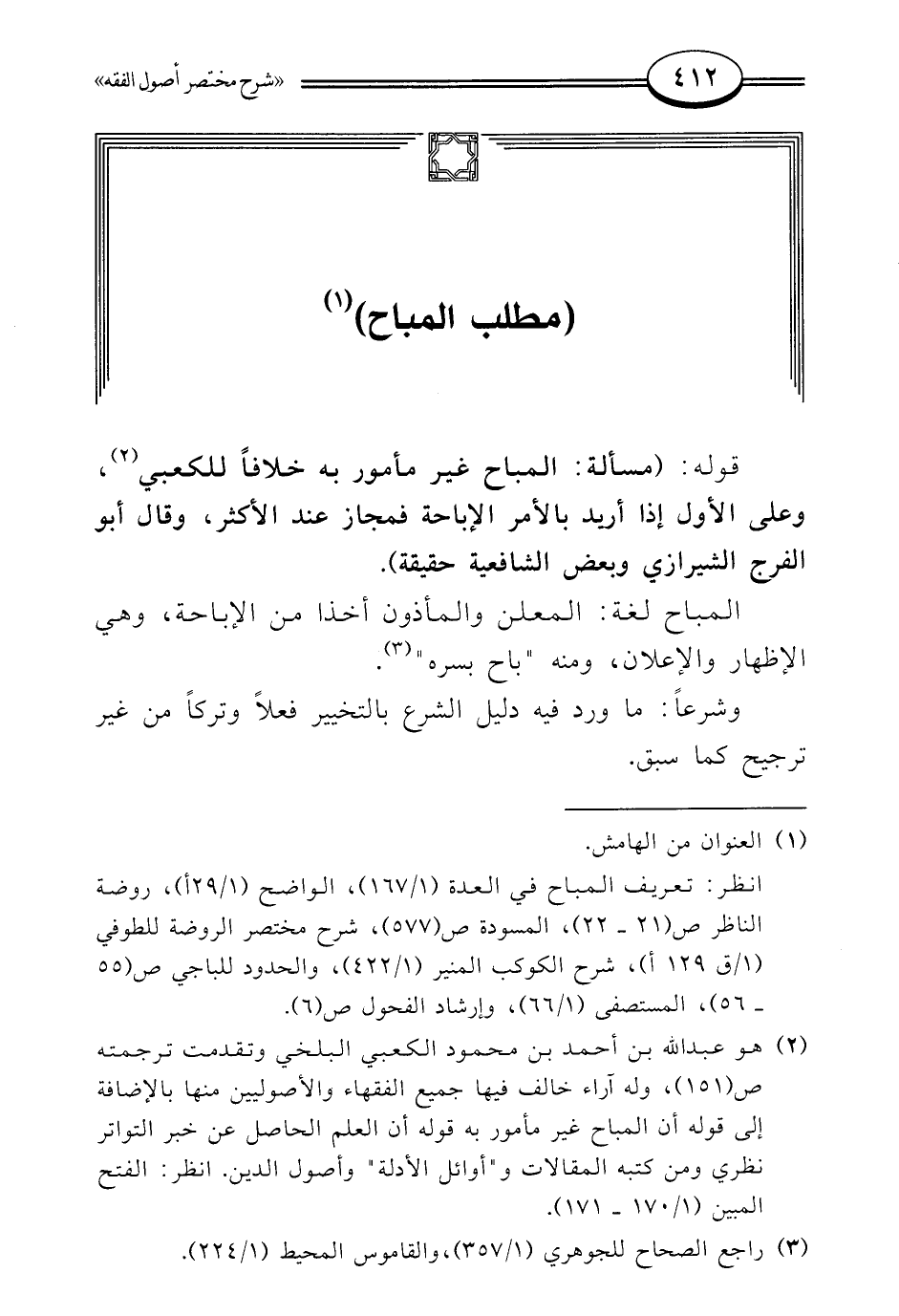 (¬2) هو عبد الله بن أحمد بن محمود الكعبي البلخي وتقدمت ترجمته ص (151)، وله آراء خالف فيها جميع الفقهاء والأصوليين منها بالإضافة إلى قوله أن المباح غير مأمور به قوله أن العلم الحاصل عن خبر التواتر نظري ومن كتبه المقالات و"أوائل الأدلة" وأصول الدين. انظر: الفتح المبين (1/ 170 - 171).